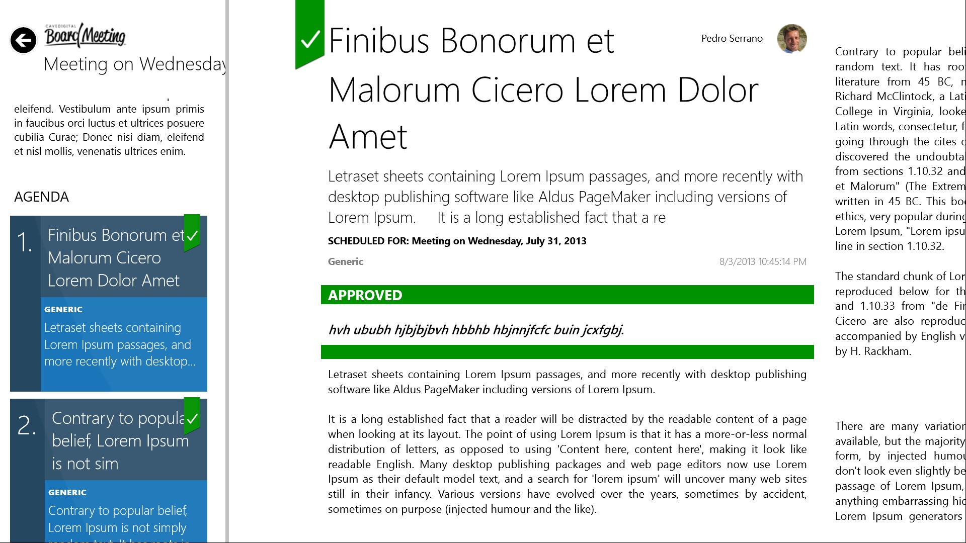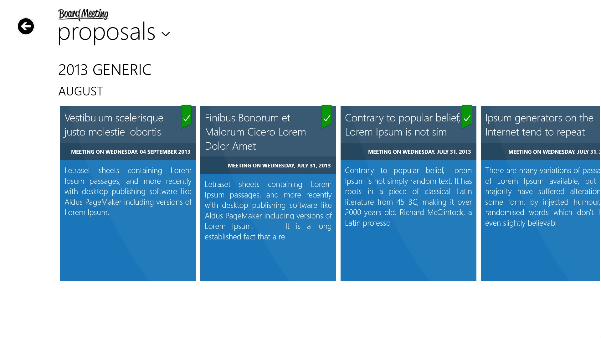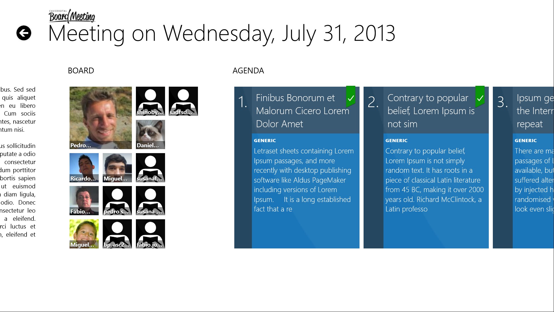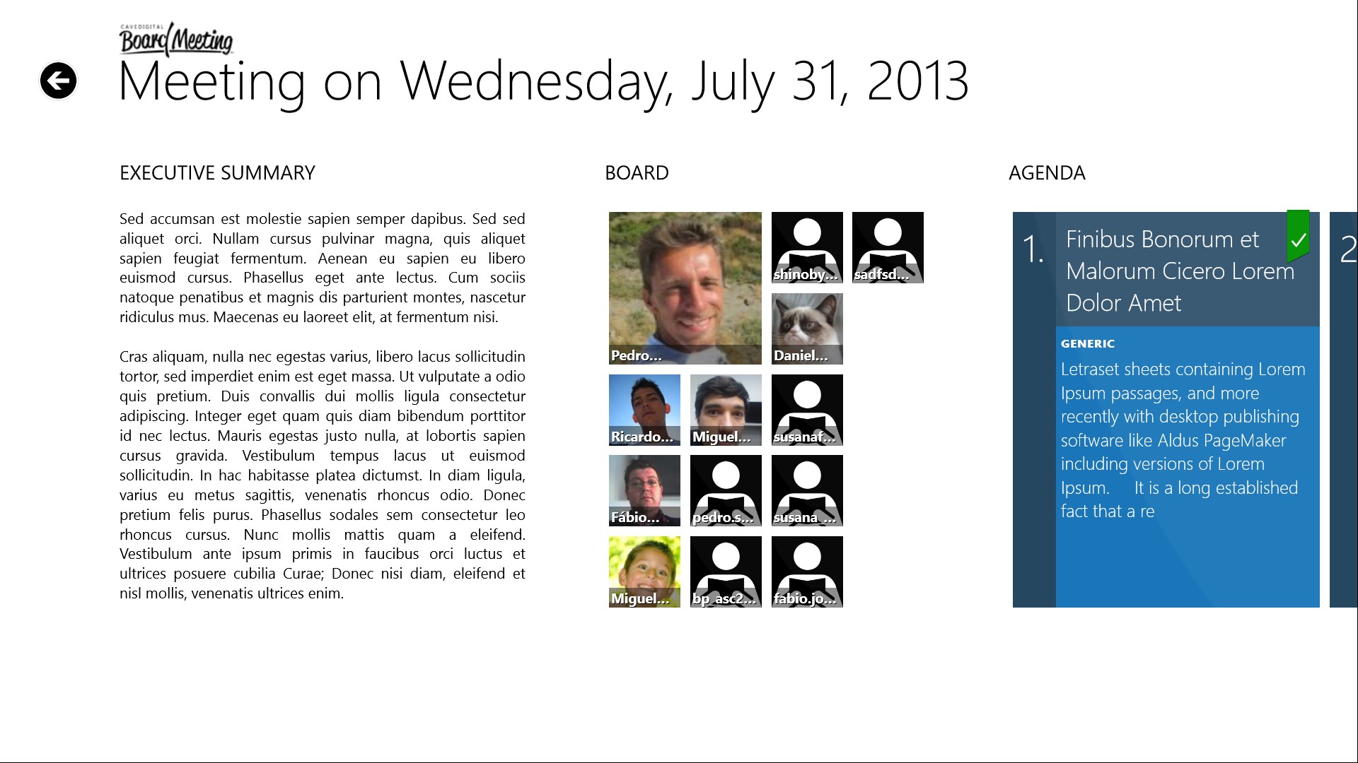 CAVEDIGITAL Board Meeting app for Windows 8 provides a clean natural touch interface for your board meetings and proposals allowing for an agile and mobile Board Member experience.