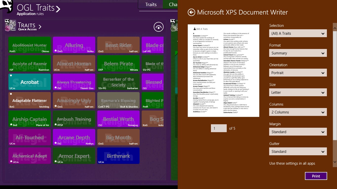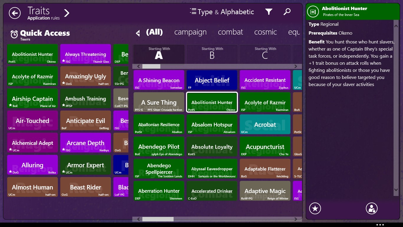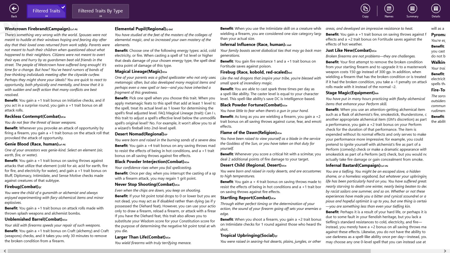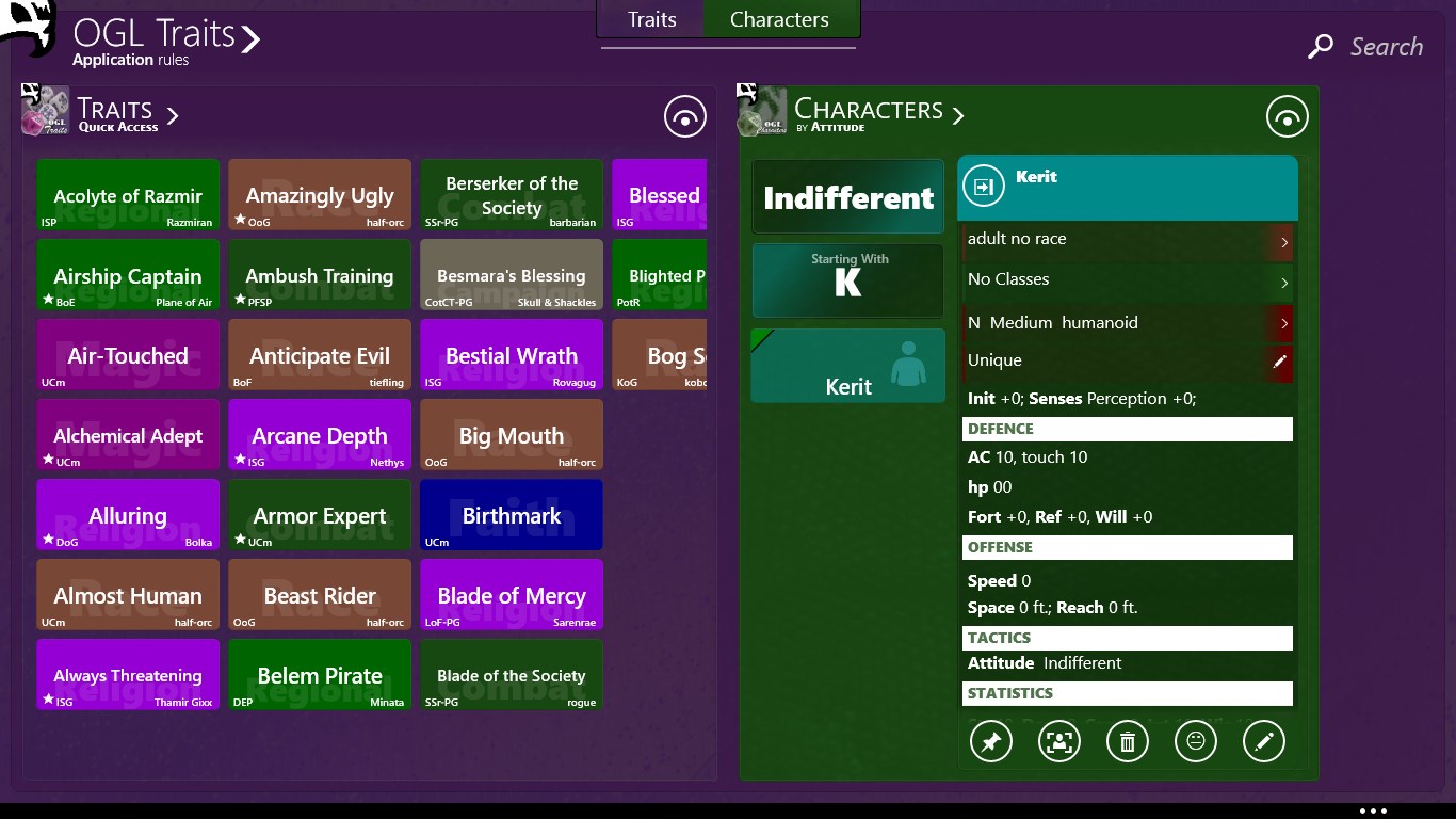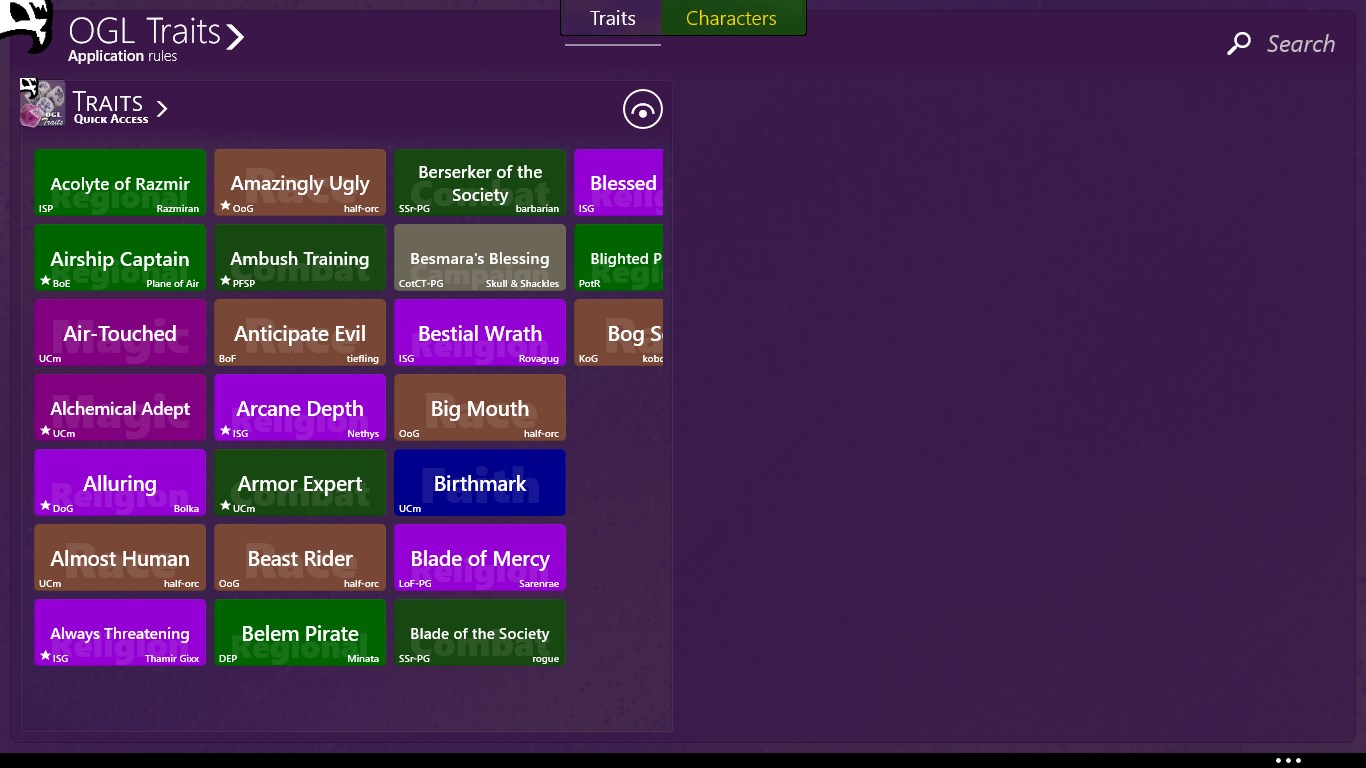 OGL Traits allows quick exploration and searching of traits for OGL games such as Pathfinder.