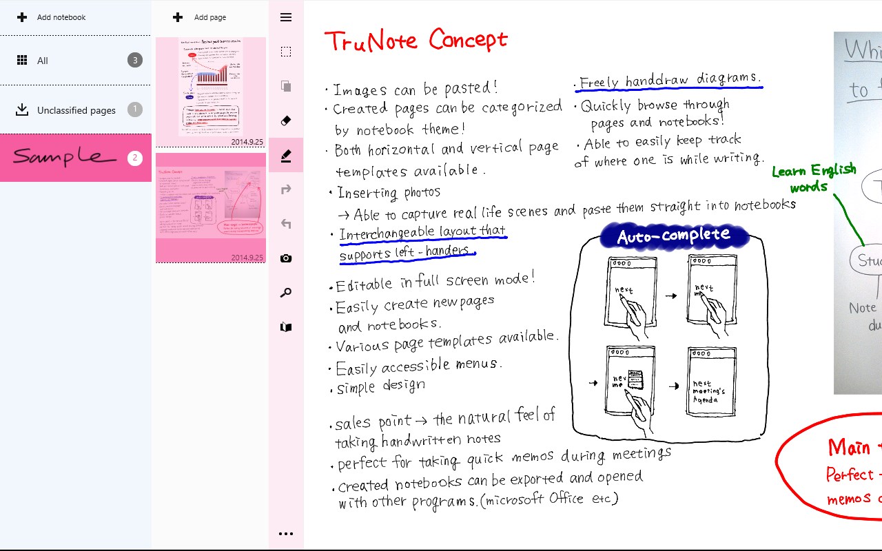 The interface is easy to change for left-handed users.Paste a taken photo after making edits.Handwritten pen attributes, such as width and color, can be changed after being written down.After using handwritten characters, the application will display suggestions to assist your handwriting. (Premium)Search pages by a handwritten key. (Premium)Search the Internet by handwritten characters or words. (Premium)Create e-mails from handwritten notes through character recognition. (Premium)Recognizes handwritten figures and tables, making it easy to paste into Microsoft(R) Office Applications. (Premium)Browse data created by TruCapture, TruRecorder and so on.Share the same TruNote data on multiple devices via OneDrive(R)