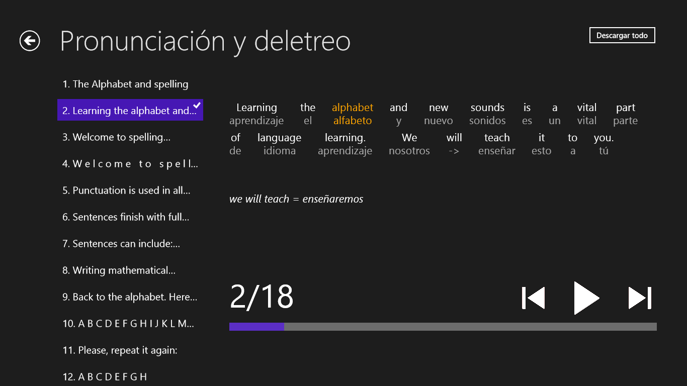 * Pronunciación y deletreo: 7 minutos, 18 oraciones, 158 palabras únicas