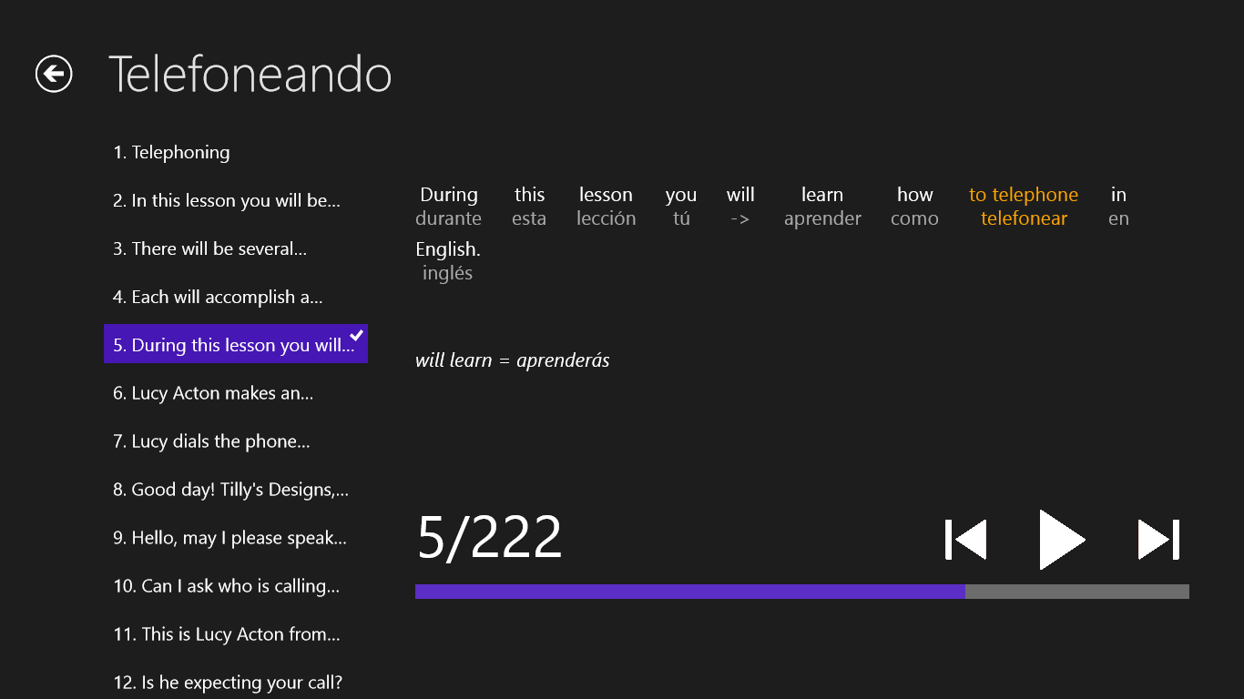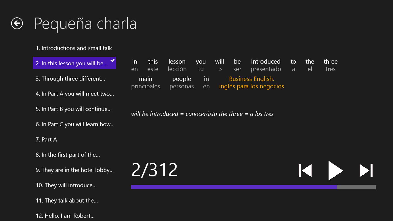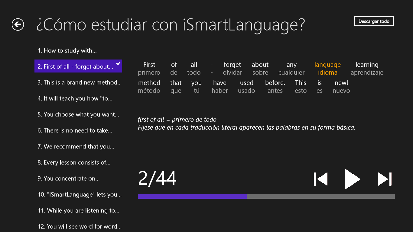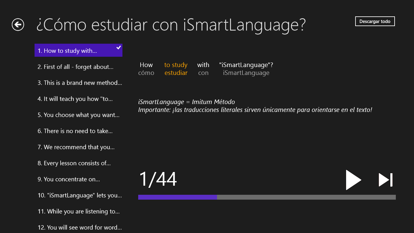 aprenda 5 veces más rápido que con un método tradicionalreproducción de las oraciones en formato para \“karaoke\” (lo que estoy escuchando, lo estoy viendo)traducciones literales con notasaprendizaje con un método eficaz, el método Imitum® - más sobre este método en www.imitum.commás sobre la aplicación en www.smart-language.com