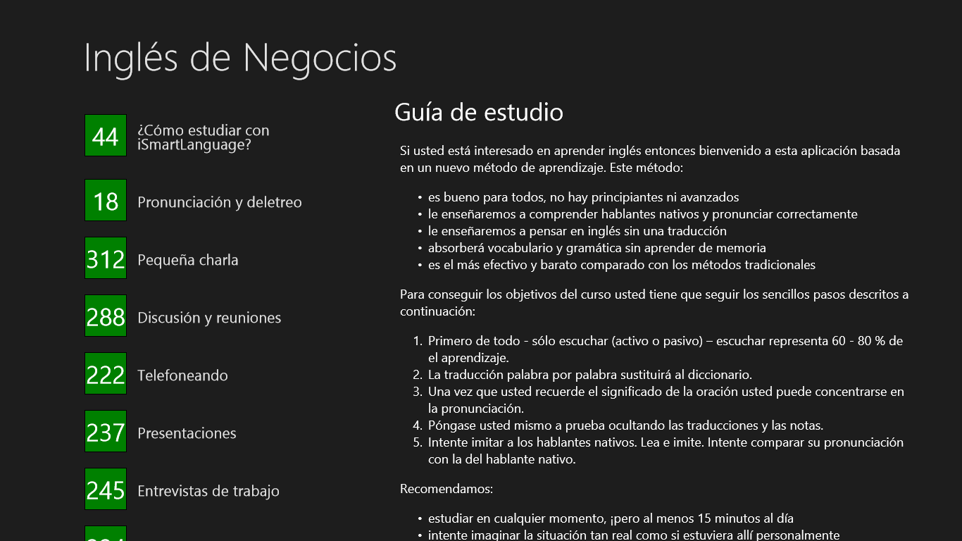 #1 aplicaciones para el aprendizaje del inglés – ¿cómo digerir el inglés de forma divertida? – ¿cómo aprender de manera natural sin tener que empollar? La aplicación es accecible GRATUITAMENTE en Windows Store. Su contenido textual en su extensión completa será disponible inmediatamente tras descargar y activar la aplicación en su dispositivo. ¿Quiere DOMINAR CON SEGURIDAD LA LENGUA EXTRANJERA, es decir, PENSAR en ella sin tener que traducir de su lengua materna, entender a los hablantes nativos y pronunciar con un acento correcto? ¡En este caso LEA CON ATENCIÓN lo que sigue a continuación! Se trata de un aprendizaje del inglés a través de un método único, basado en investigaciones científicas, y aprobado por nuestros clientes del mundo entero. ¡Este método de aprendizaje de lenguas extranjeras es considerado como uno de los más eficientes para autodidactas! Aproveche hasta el 97 % de sus sentidos y de su memoria lógica, la más eficiente clase de memoria, en la que las informaciones se guardan en conjuntos lógicos (frases enteras, historias). De una forma similar aprenden su lengua materna también los niños pequeños. Así que ¿por qué usted debería ser una exepción? Los niños primero escuchan, después imitan a los adultos y al final tratan de formar sus propias uniones de palabras y oraciones. Aquí aprenderá ÚNICAMENTE la pronunciación correcta, ya que escucha solamente a hablantes nativos. Cada lección de Inglés de Negocios está cuidadosamente preparada por hablantes nativos de EE.UU. y Reino Unido. Los temas se basan en el tipo de situaciones que son más comunes en la vida real. Ventajas del método SmartLanguage: * no se aprende de memoria * usted subconscientemente también aprenderá la gramática mediante la repetición de una gran cantidad de sentencias * no hay necesidad de un diccionario (hay traducciones palabra por palabra) * fácil de entender cómo construir frases en inglés SmartLanguage es tan simple y fácil de usar. No hay pequeñeces innecesarias. Aplicación consta de: * 2,5 horas de grabaciones de voz * 2793 palabras únicas (vocabulario) * un total de 9 clases, 2077 sentencias, 22729 palabras Además: * Cómo estudiar inglés: 8 minutos, 44 sentencias, 264 palabras únicas (vocabulario) * Pronunciación y deletreo: 7 minutos, 18 oraciones, 158 palabras únicas * Verbos irregulares: 42 minutos, 1 377 oraciones, 1 873 palabras únicas Para obtener más información por favor no dude en visitar el sitio del producto en www.Smart-Language.com. A nosotros nos preocupa la calidad y su satisfacción. Si usted desea expresar algo a nosotros, por favor, envíe un mensaje a nuestro soporte técnico directamente desde la aplicación, es la única manera en la que somos capaces de responder.