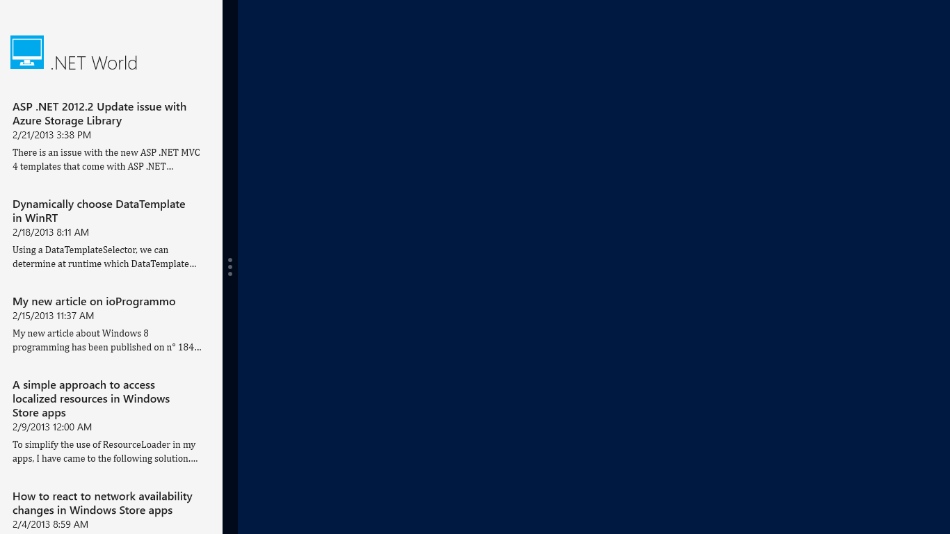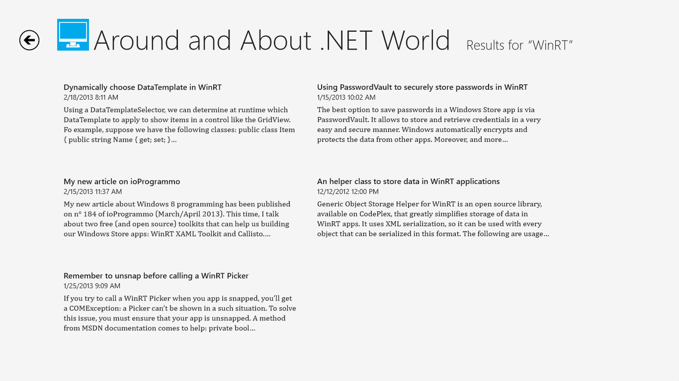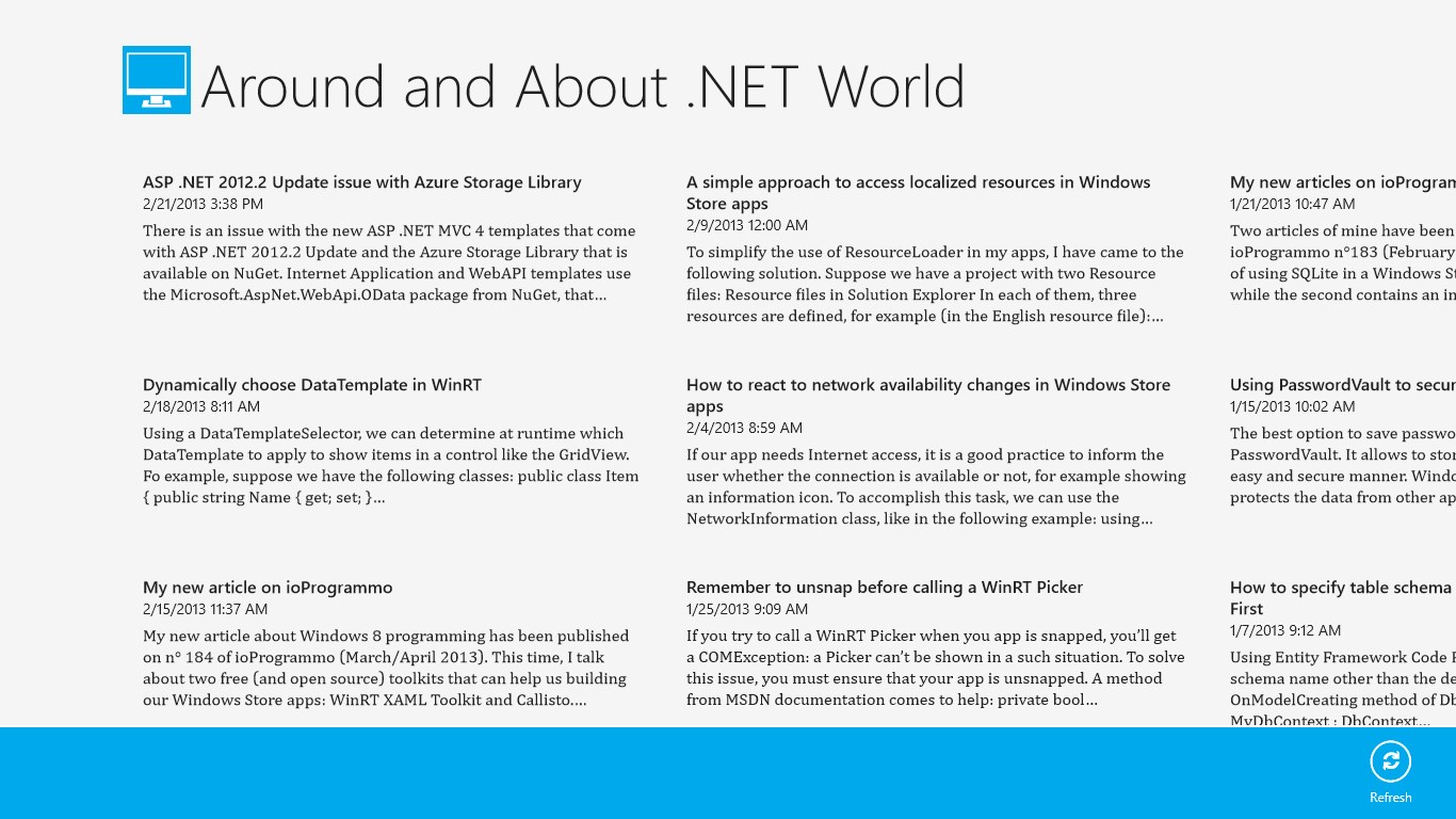 The content of Around and About .NET World blog always on your PC! With this app, you can easily access the posts that will be regularly published. You can see the most recent posts in the Live tile of the app. If you find something interesting, you can share it using the Share charm of Windows 8. You can also visit the Web site and the Twitter account of the author of the blog.