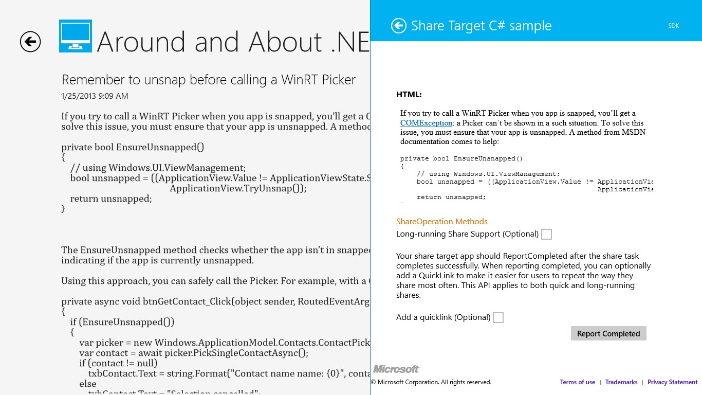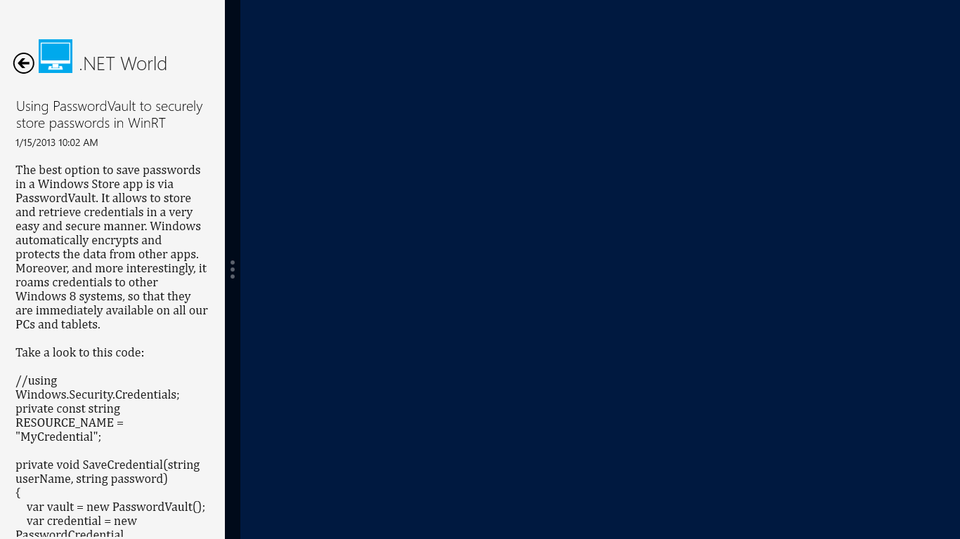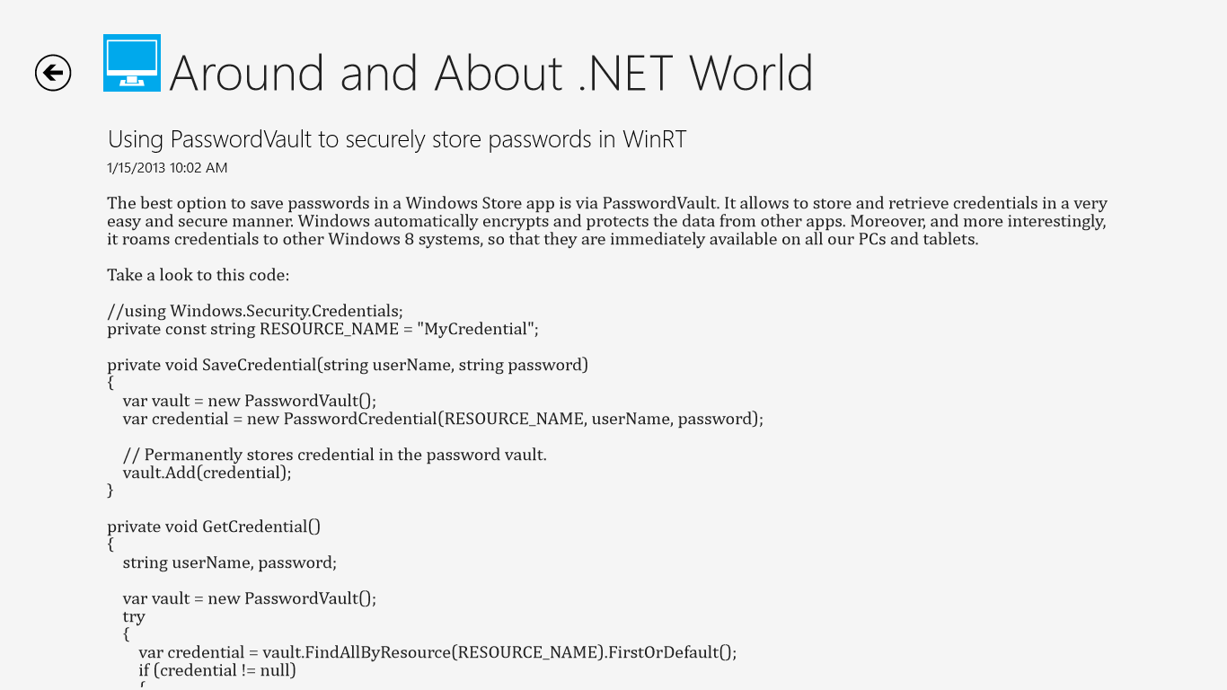 The content of Around and About .NET World blog always on your PC! With this app, you can easily access the posts that will be regularly published. You can see the most recent posts in the Live tile of the app. If you find something interesting, you can share it using the Share charm of Windows 8. You can also visit the Web site and the Twitter account of the author of the blog.