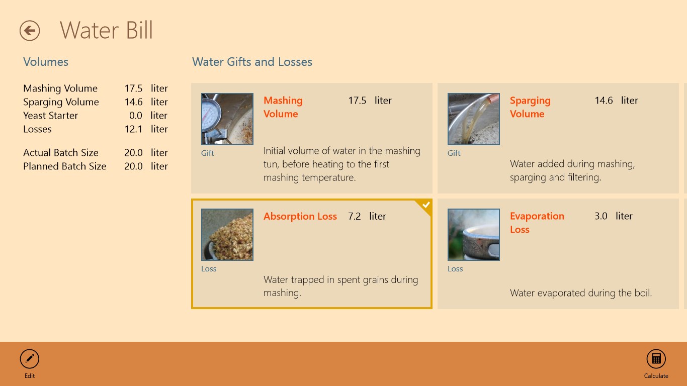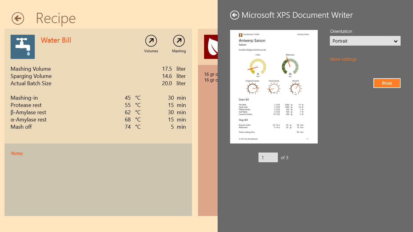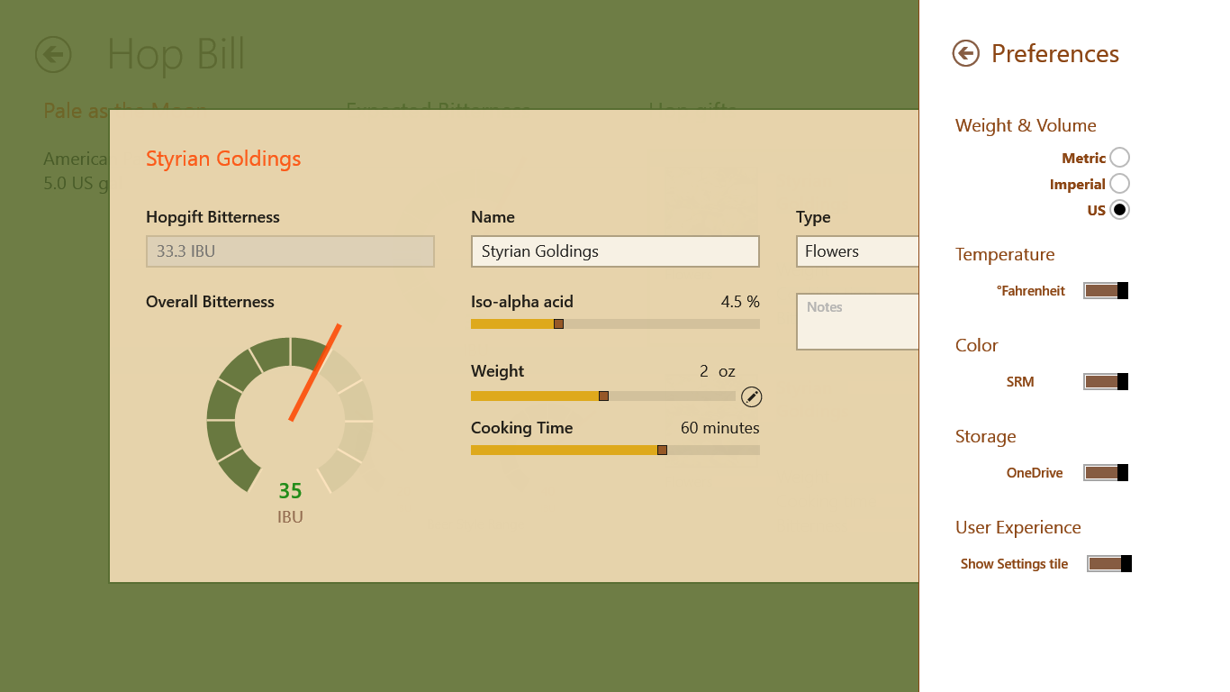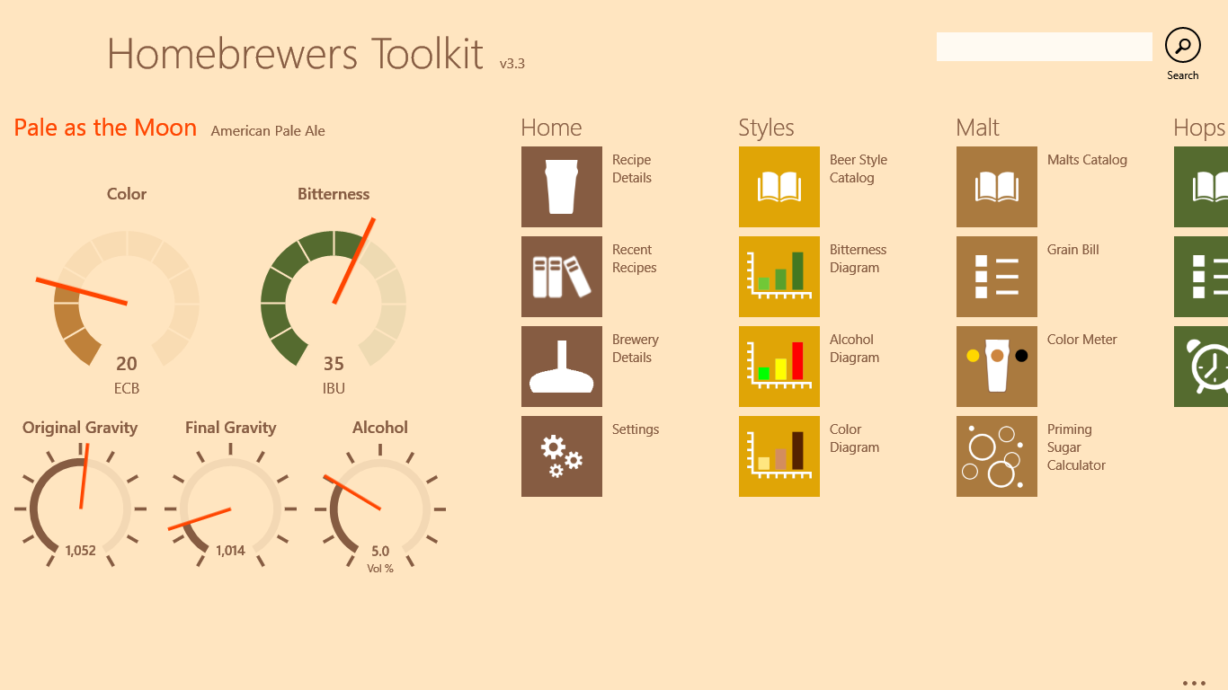 Manage grain bill, hops bill, yeast bill, and water bill.Full catalog of ingredients: brewing sugars, hops, and yeasts.Use your own unit measure for volume, weight, temperature, and color.Predict gravities, color, and bitterness.Choose beer style through interactive diagrams: color, bitterness, and alcohol by volume.Calculate yeast attenuation, priming sugar, and remaining volume in bin.Select infusion mashing steps individually or from mashing profile templates.Print a comprehensive overview of your recipe.Plenty of room for your own notes and comments.Measure beer color.Scale an existing recipe to a target batch volume.Balance mashing and sparging water volumes.Pin your current and/or favorite recipes to the start page as a secondary tile.Backup and synchronize your recipes across all your devices through OneDrive.Monitor the mashing and cooking process with toasts and live tile.