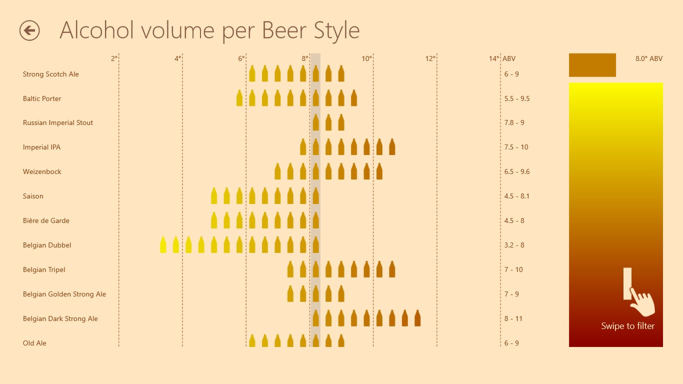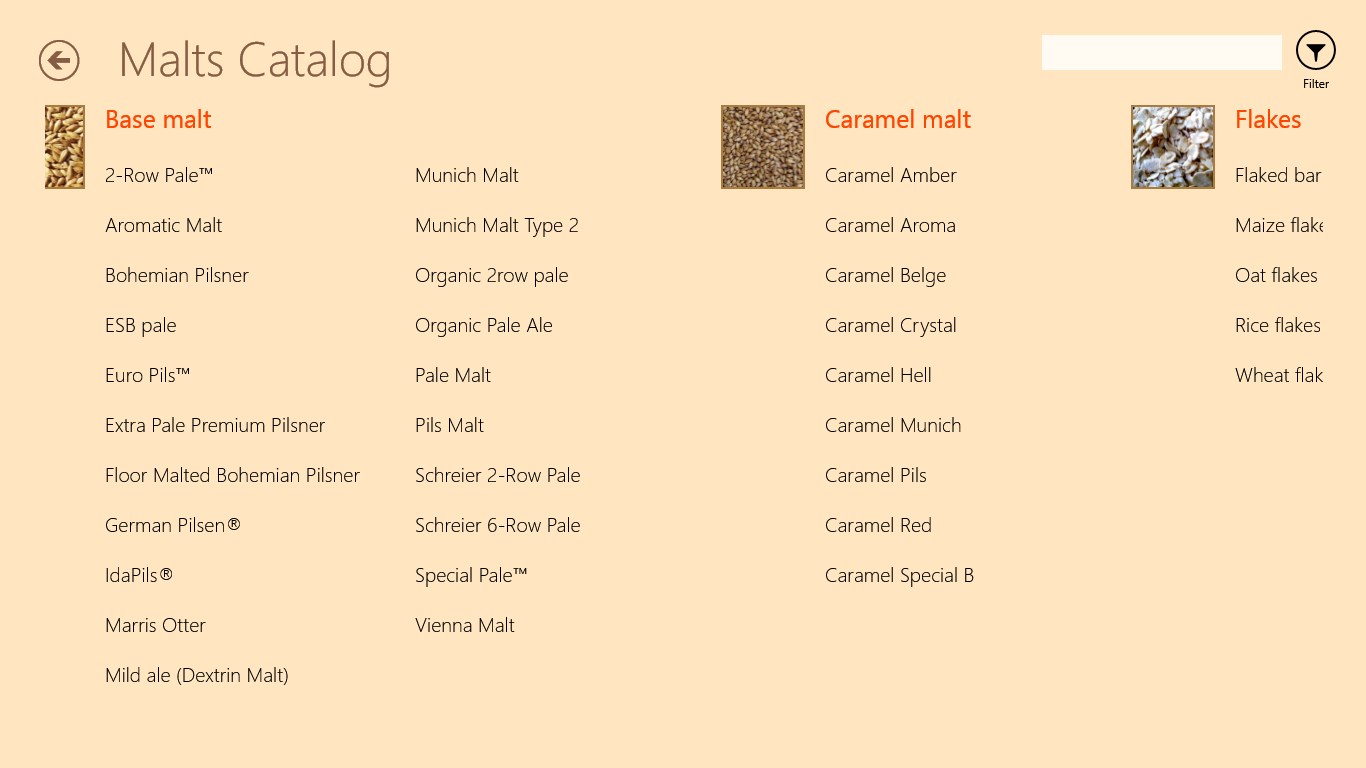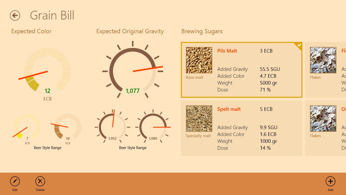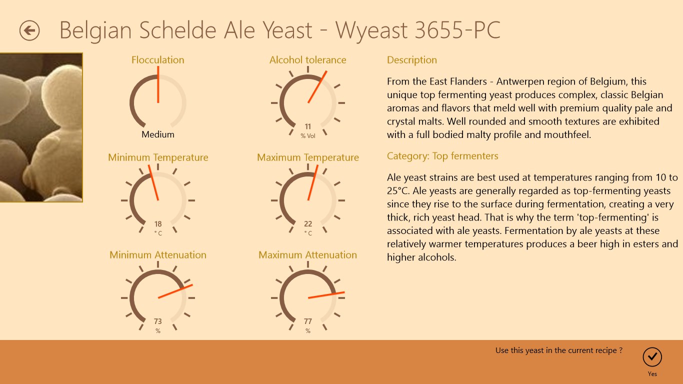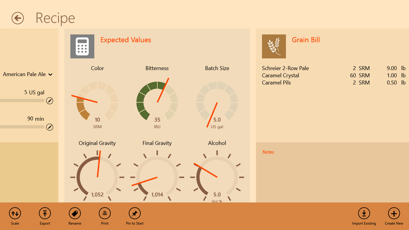 Manage grain bill, hops bill, yeast bill, and water bill.Full catalog of ingredients: brewing sugars, hops, and yeasts.Use your own unit measure for volume, weight, temperature, and color.Predict gravities, color, and bitterness.Choose beer style through interactive diagrams: color, bitterness, and alcohol by volume.Calculate yeast attenuation, priming sugar, and remaining volume in bin.Select infusion mashing steps individually or from mashing profile templates.Print a comprehensive overview of your recipe.Plenty of room for your own notes and comments.Measure beer color.Scale an existing recipe to a target batch volume.Balance mashing and sparging water volumes.Pin your current and/or favorite recipes to the start page as a secondary tile.Backup and synchronize your recipes across all your devices through OneDrive.Monitor the mashing and cooking process with toasts and live tile.