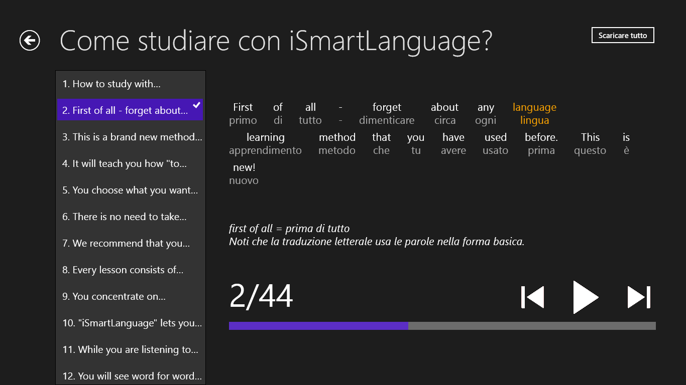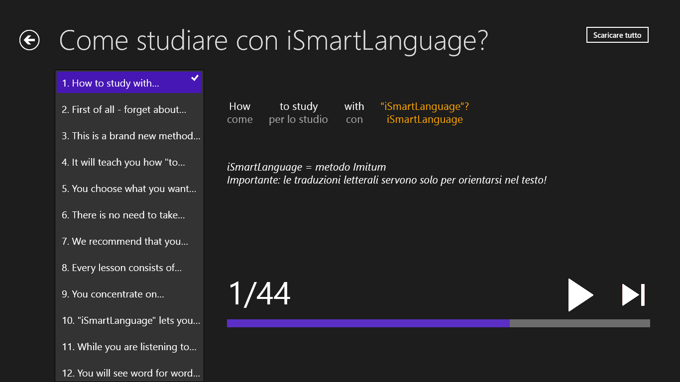 apprendi 5 volte più veloce che con i metodi comunile frasi sono suonate nel modo di karaoke (ascolto ciò che vedo)le traduzioni letterali con appuntiinsegnamento con il metodo effettivo chiamato Imitum® - per sapere più sul metodo vedi www.imitum.compiù informazioni sull\'applicazione in www.smart-language.com
