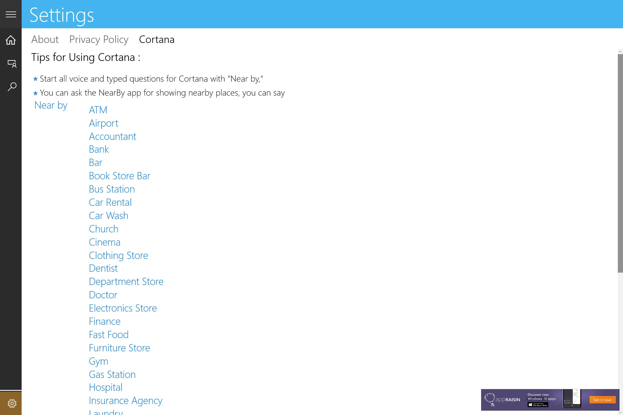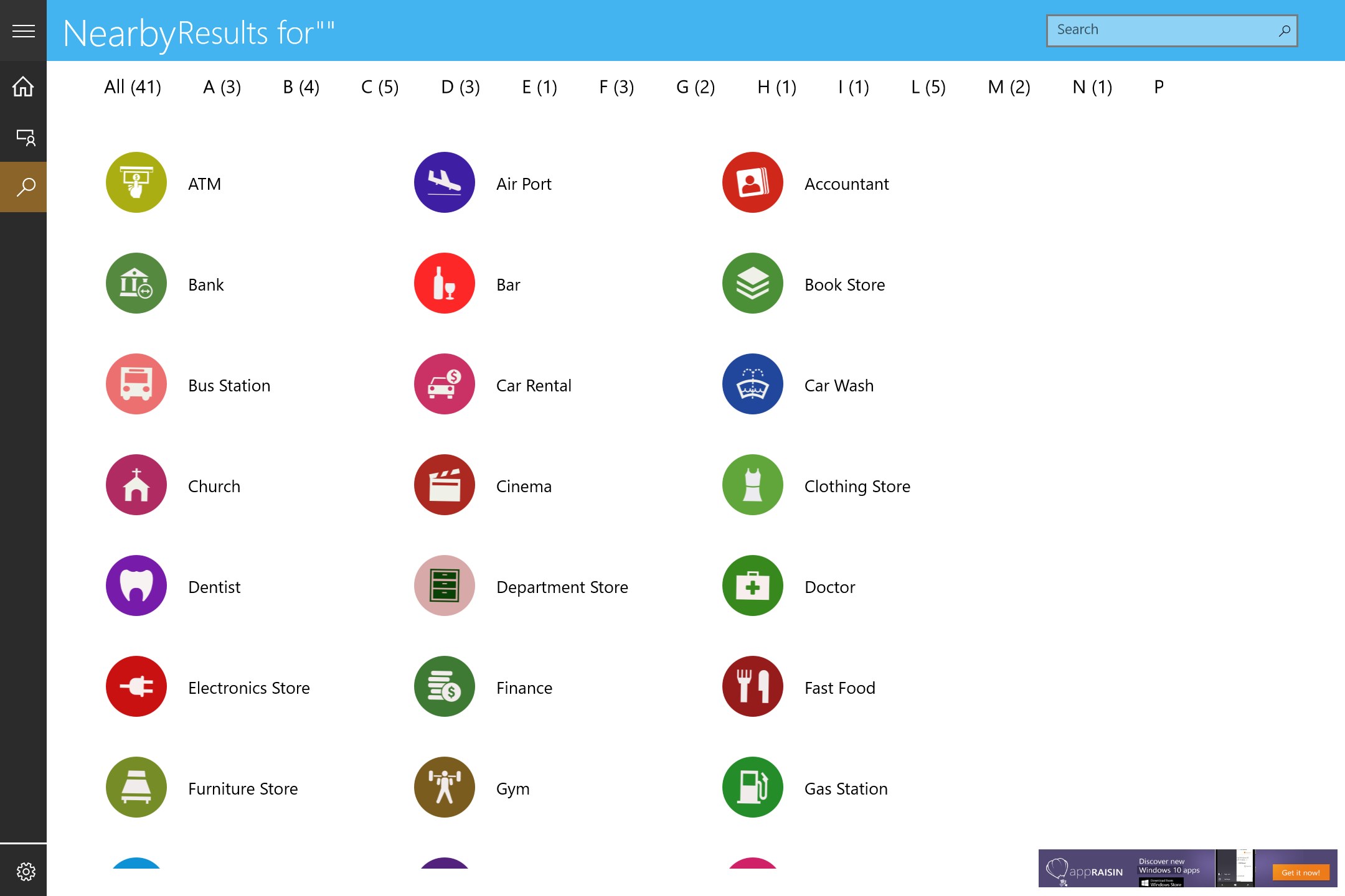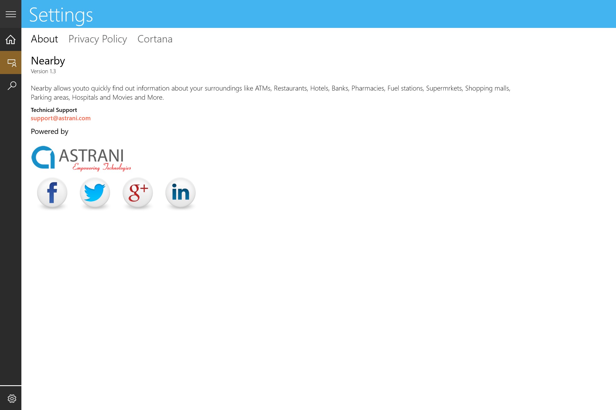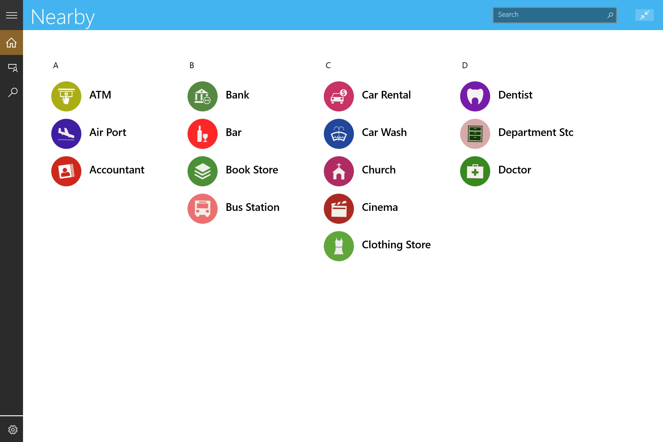 Nearby allows you to quickly find out information about your surroundings like ATM, Restaurants, Hotels, Banks, Pharmacies, Fuel stations, Supermarkets, Shopping malls, Parking areas, Hospitals and Movies and more.