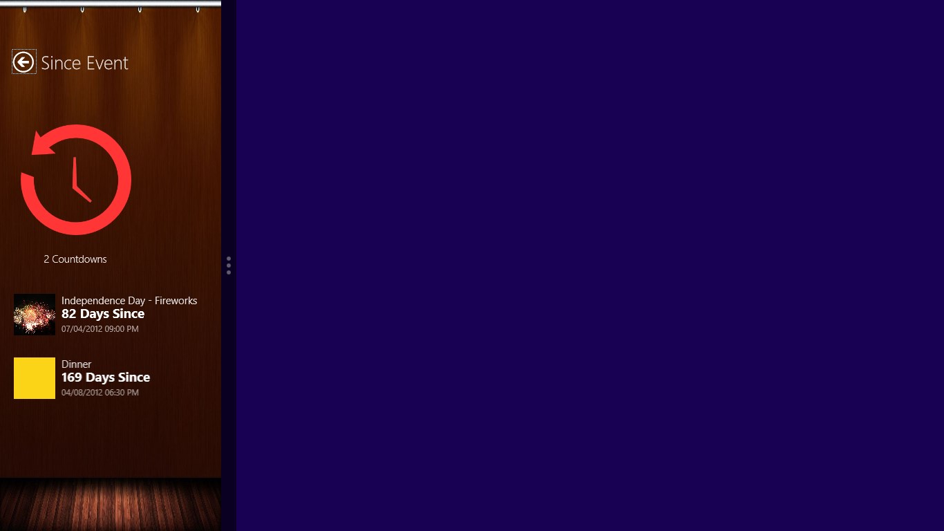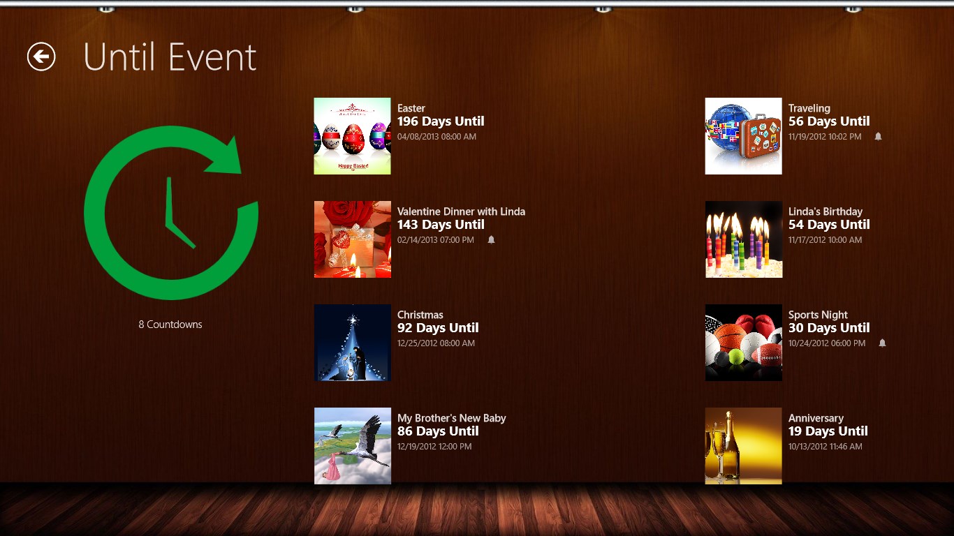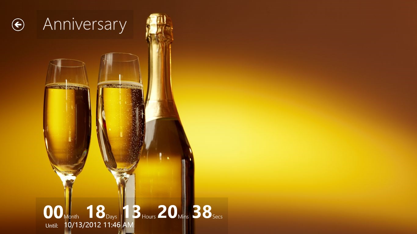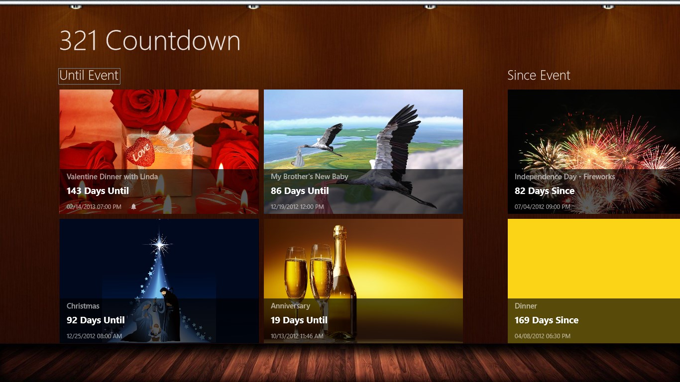 Countdown time remaining before event or time since event.Custom background images from your photo album or 321 Countdown\'s default stock photos.View events grouped by Pre-Event or Post Event.Live countdown by Years, Months, Days, Minutes and Seconds.Individual alerts for each countdown event.Alerts can be set preceding the event or following the event.Pin any Countdown as a Secondary Tile showing Days Left to event.Each Pinned Countdown shows custom background image.Main application icon cycles through pinned Countdowns.