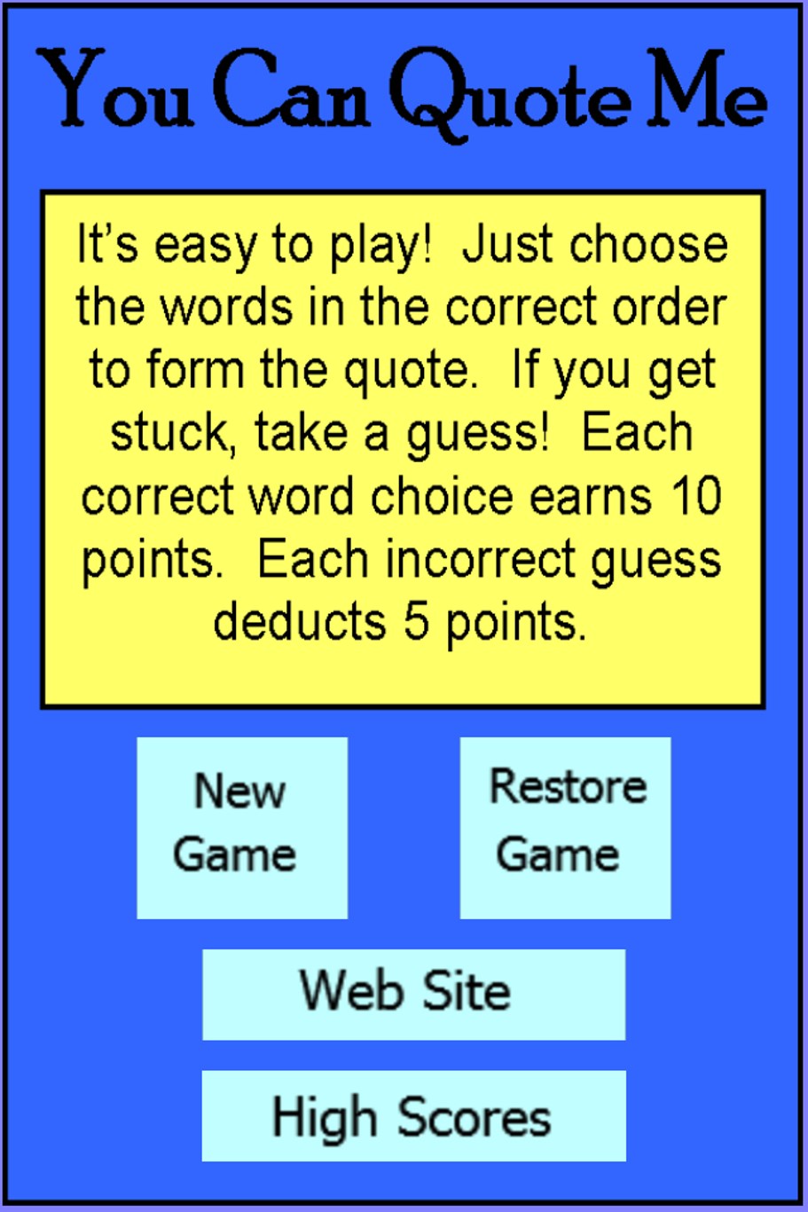 A fun and easy quote game. Unscramble the words to reveal the wisdom of the ages. Wise, wonderful, and witty quotes. Don't worry if you don't know the quote. You don't lose many points by guessing!