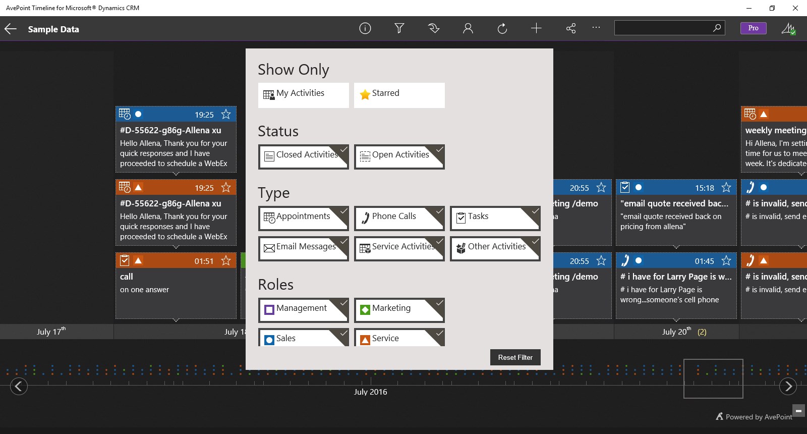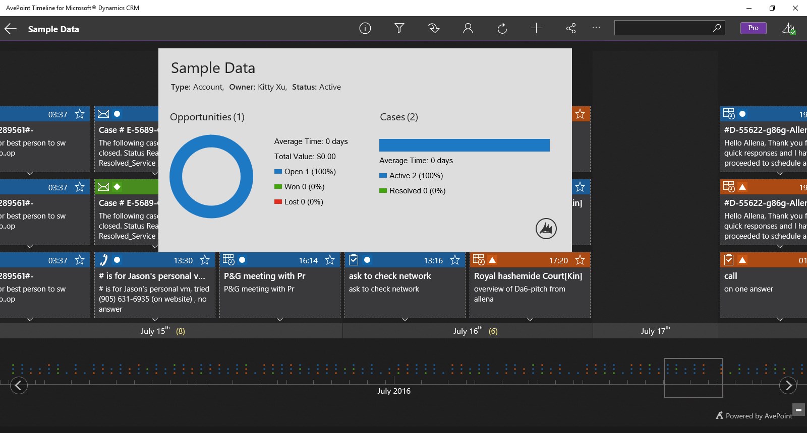 AvePoint Timeline for Microsoft Dynamics CRM empowers business users – including sales, marketing, and support – to be more productive when preparing for customer interaction on the go. AvePoint Timeline displays all relevant record or account information in a consolidated and interactive interface for mobile devices. Users can quickly gain insight into activity trends, change activity status, as well as add new activities and annotations. With rich features available in Timeline Pro, presented data can be tailored for business users in a variety of organizational roles in order to meet your unique CRM system implementation requirements. Organizations have more power than ever to customize and configure Timeline Pro to ensure optimal business user productivity.