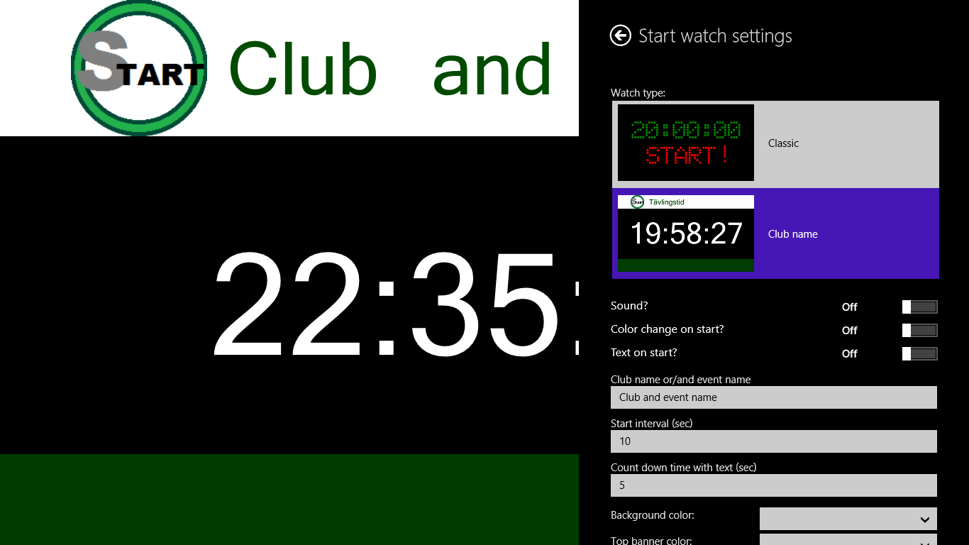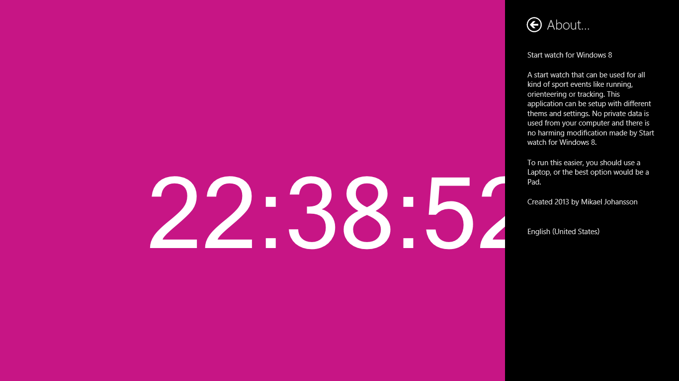 Start Watch for Windows 8 is an application to be used for starts in Orienteering, Running, Skiing, tracking, bicycling, and so on. This watch can be set up with or without sound. You can set it up with or without color coding and use many different layout depending on your needs. Start Watch for Windows 8 is not using any data on your computer and is save to use. There is no access to your personal information.