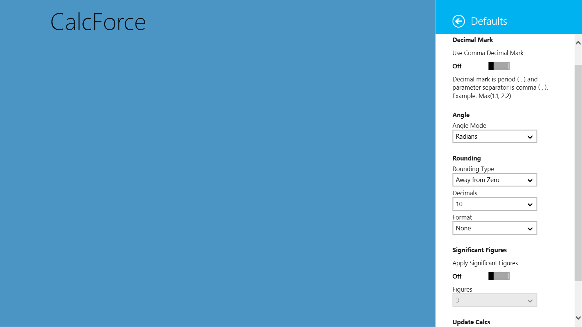 Calculation data is automatically saved so you can use the next time you open CalcForce.