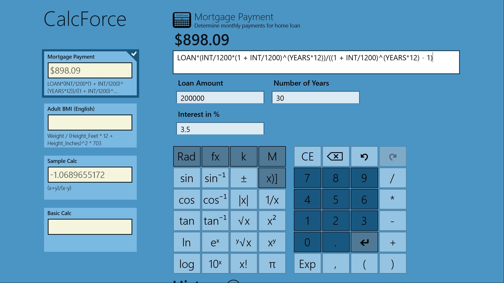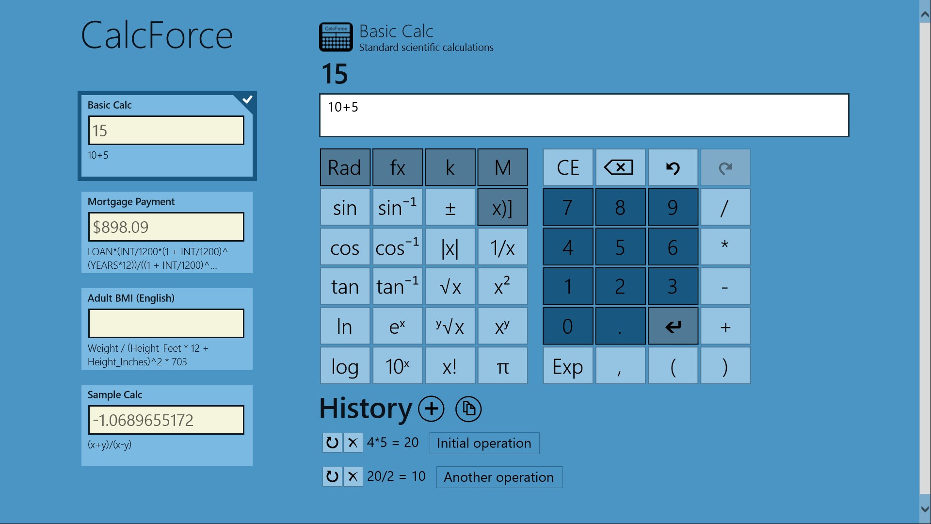CalcForce operates both as a standard scientific calculator and as a multi operation, multi variable calculator.
