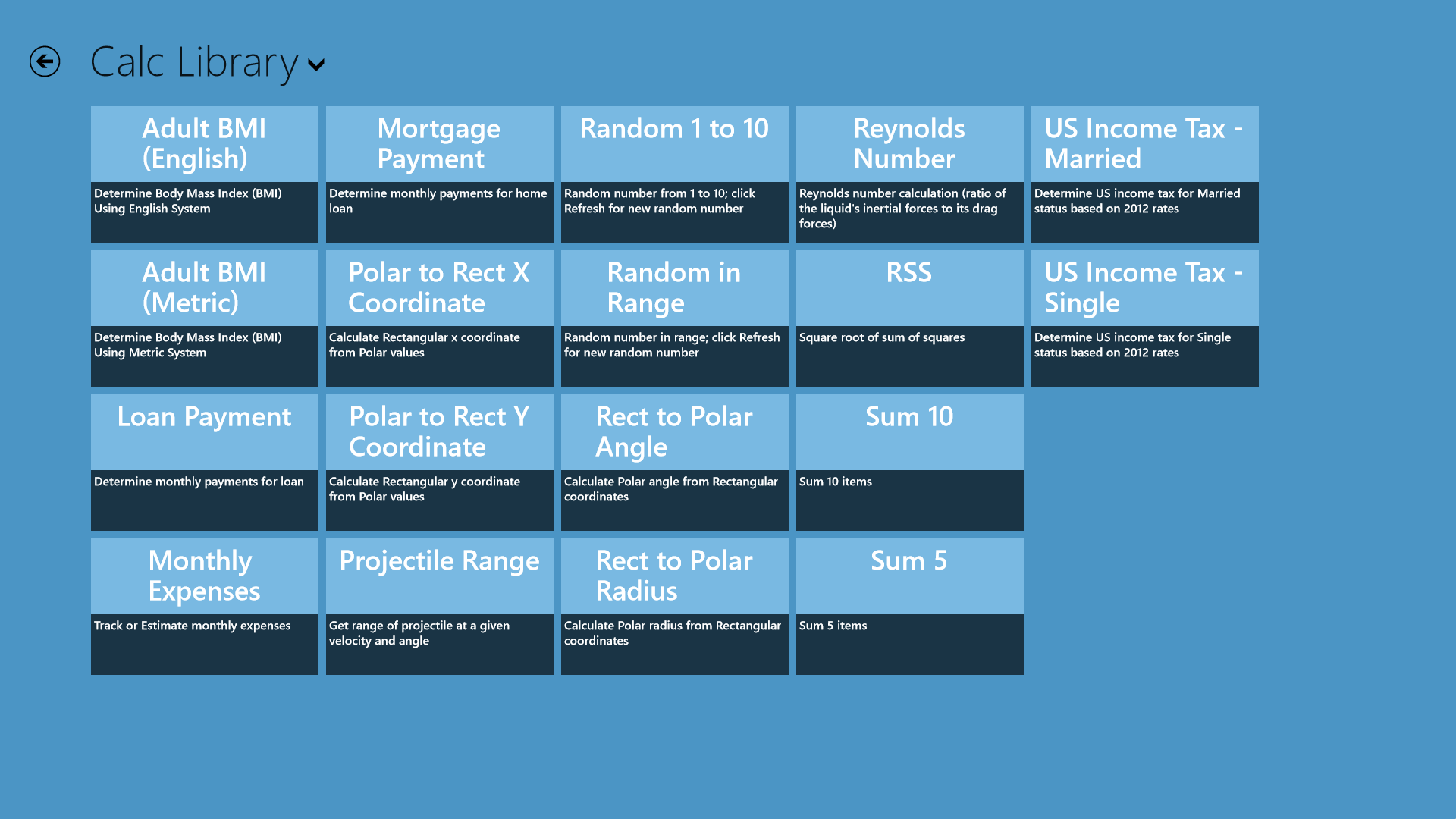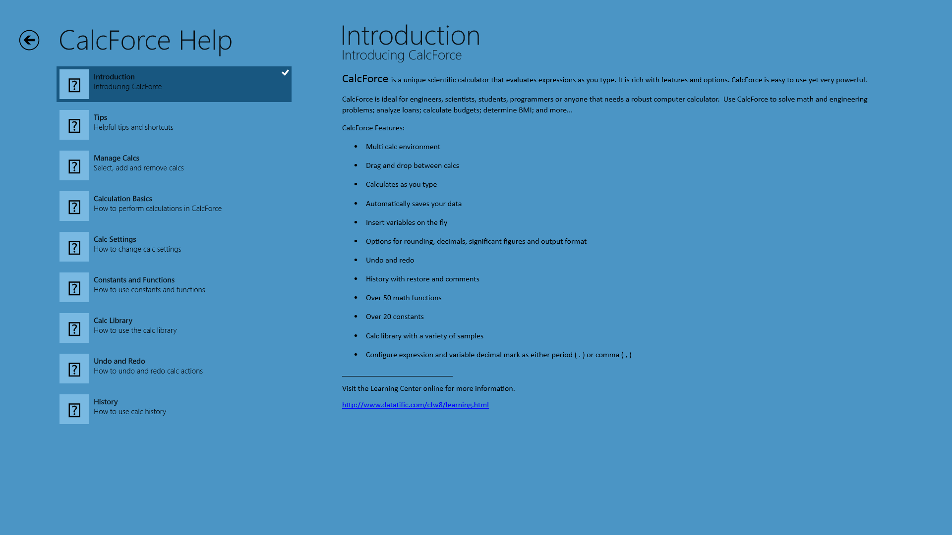 Multi calc environmentDrag and drop between calcsCalculates as you typeAutomatically saves your dataInsert variables on the flyOptions for rounding, decimals, significant figures and output formatUndo and redoHistory with restore and commentsOver 50 math functionsOver 20 constantsCalc library with a variety of samplesConfigure expression and variable decimal mark as either period ( . ) or comma ( , )