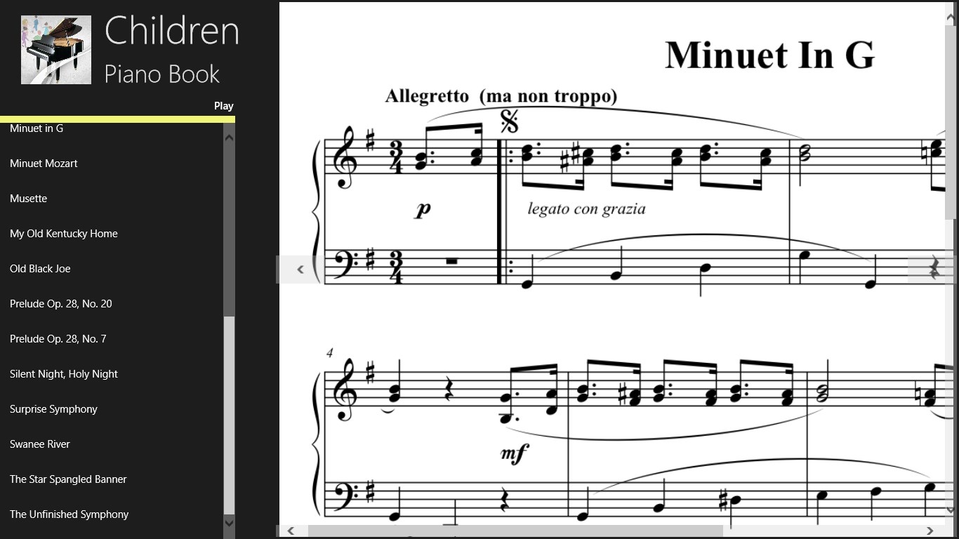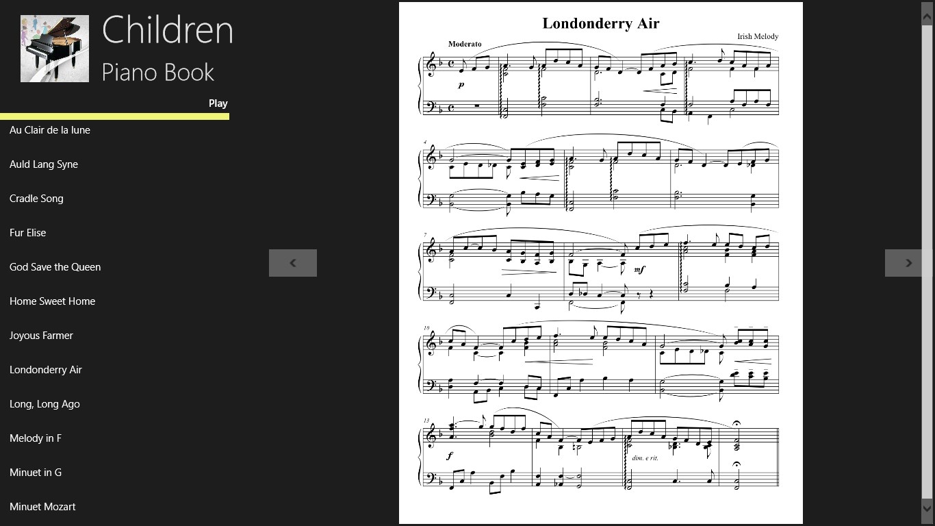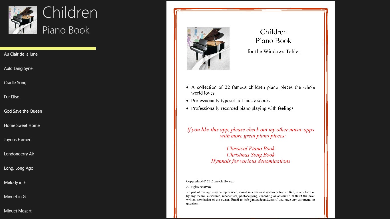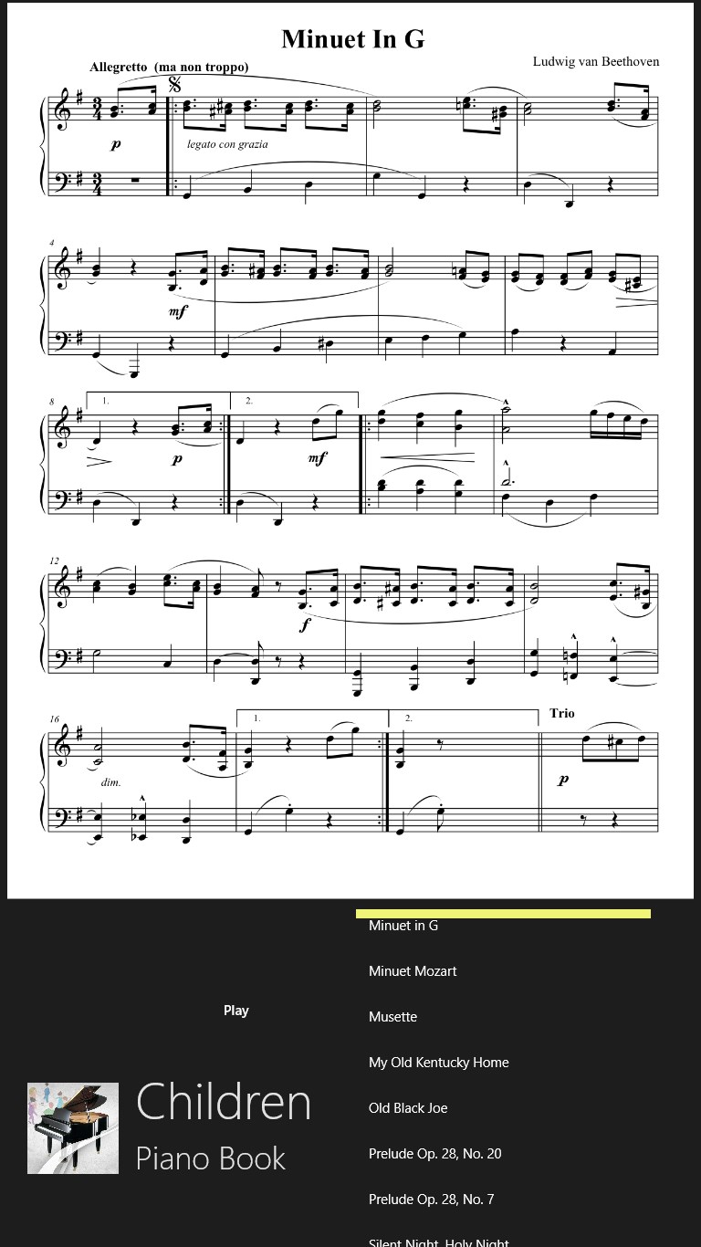 Use this like a printed piano book or enjoy the beautiful piano playing. Professionally typeset full music scores. Professionally recorded piano playing with feelings. Easy to use interface. Clean layout with no ads.