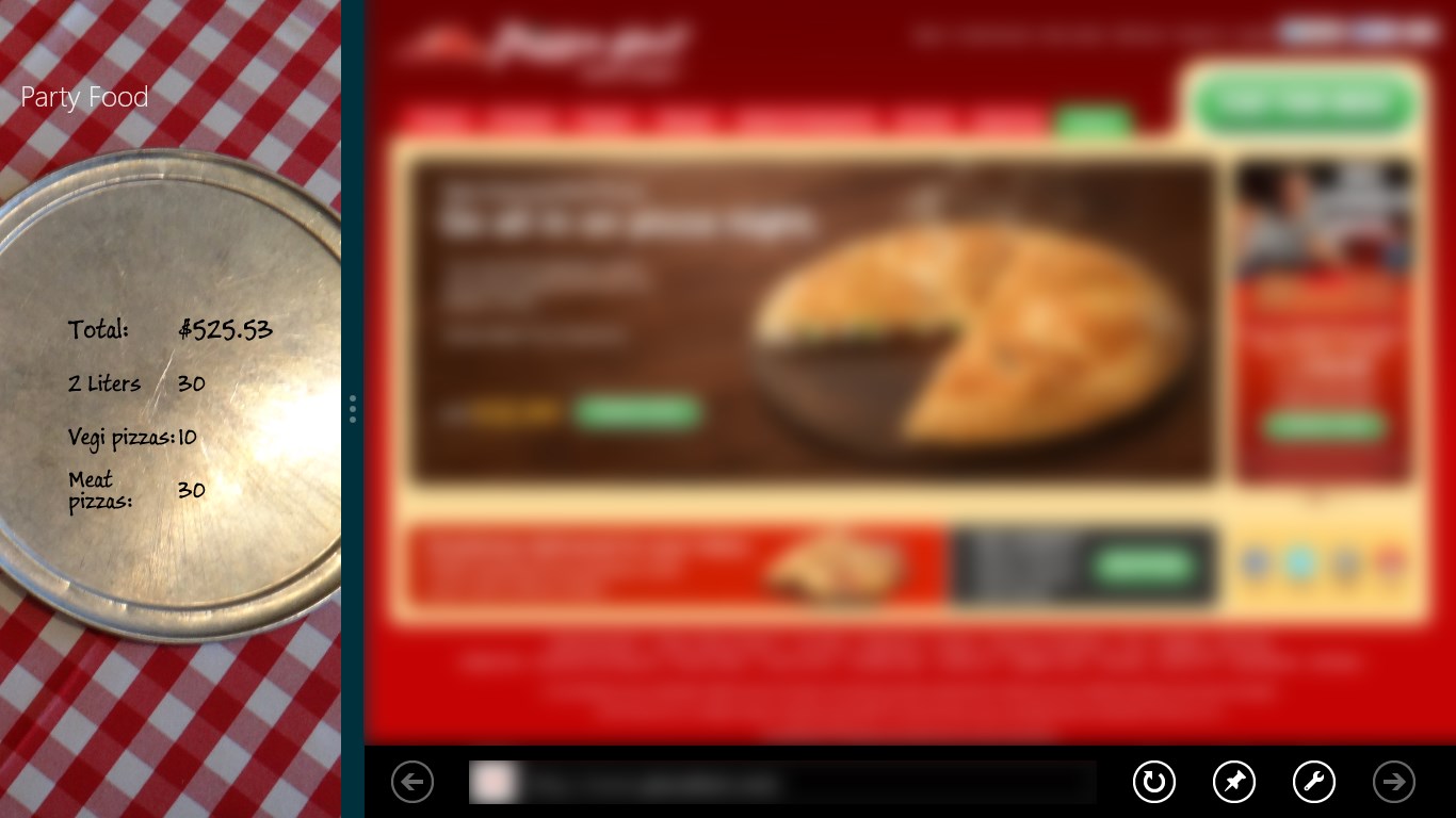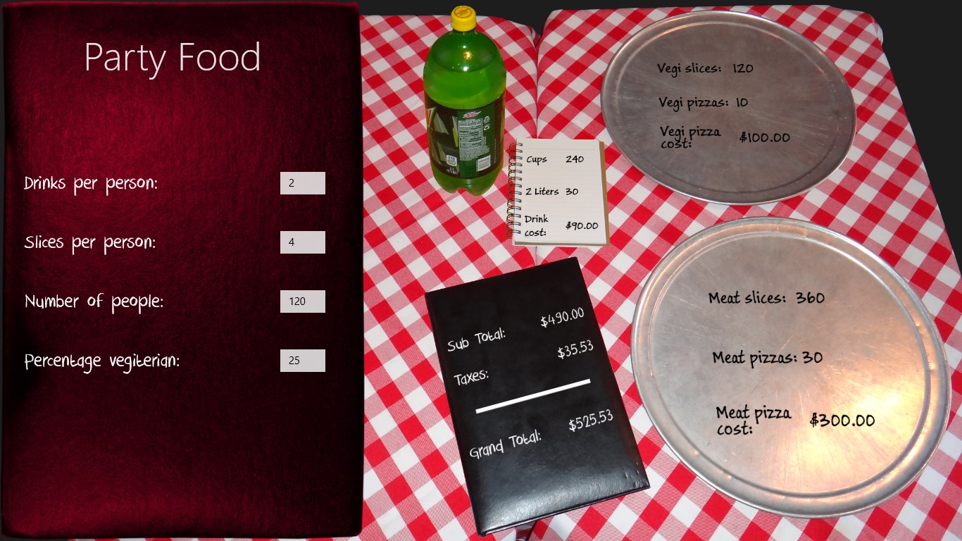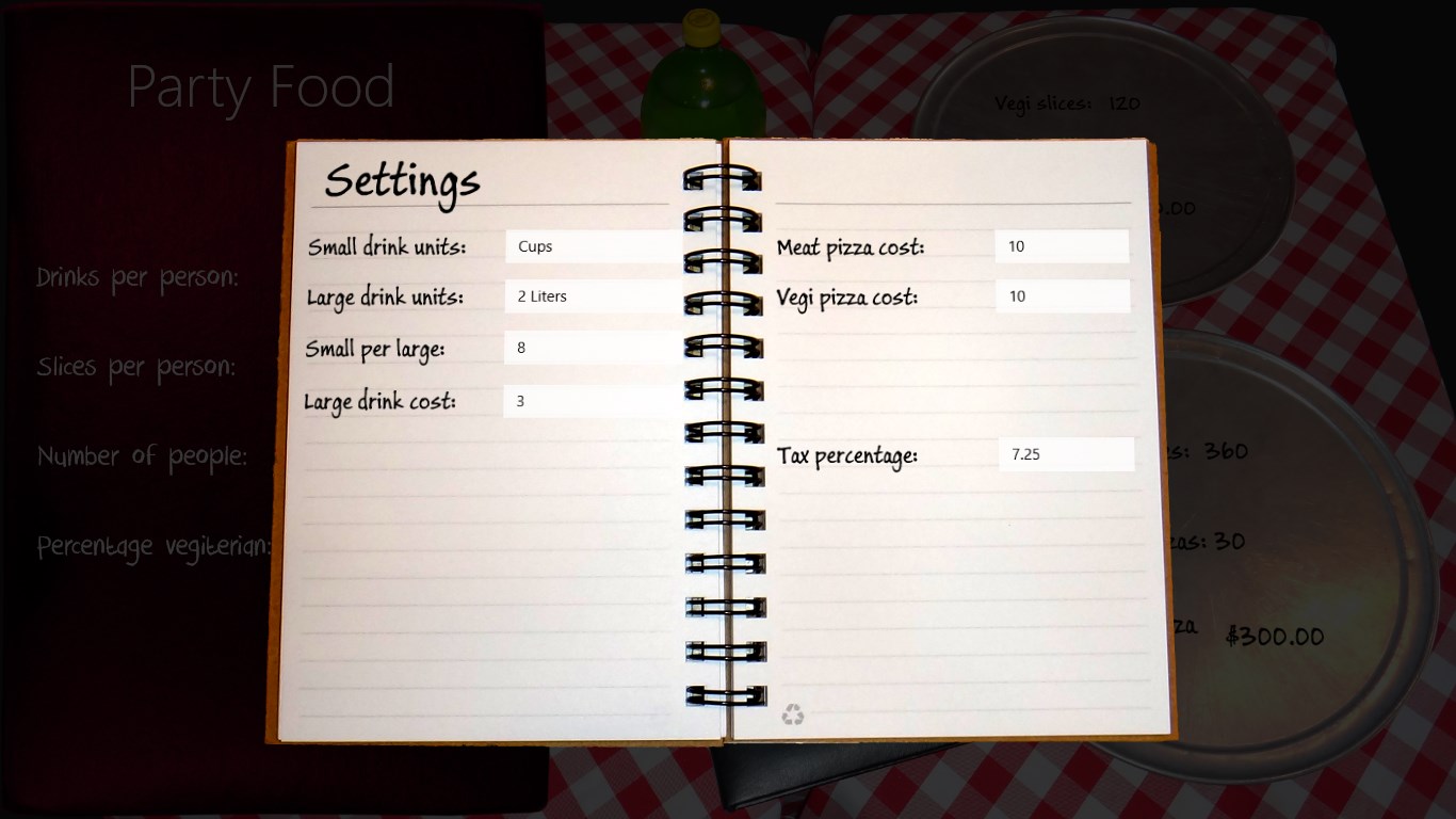 Enter the number of attendees and Party Food tells you what to order and how much it’s going to cost. Quickly change common settings right on the home screen, like number of drinks per person and what percentage of your party is vegetarian. From the settings charm change more advanced settings like the cost per pizza and the tax rate for your area. Finally, snapped view and live tiles remember the details, so even if you switch to another app you’ll remember exactly what to order.