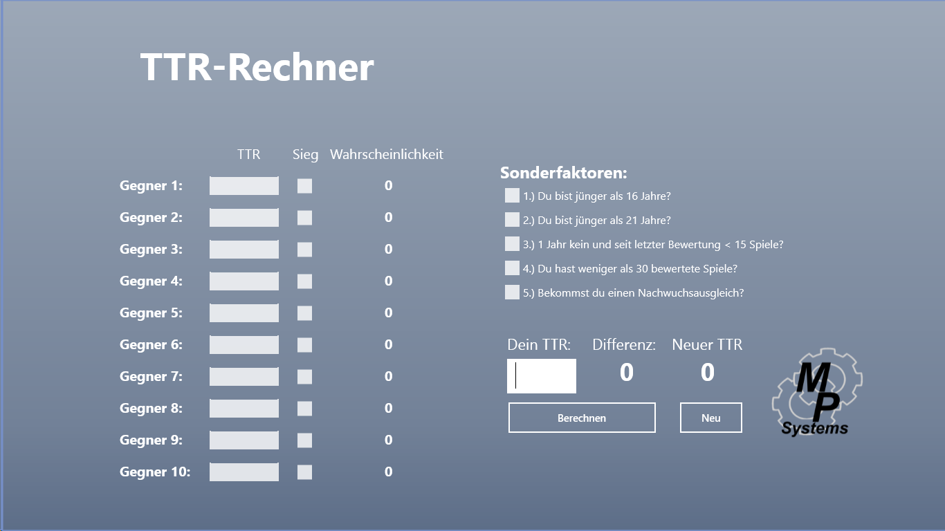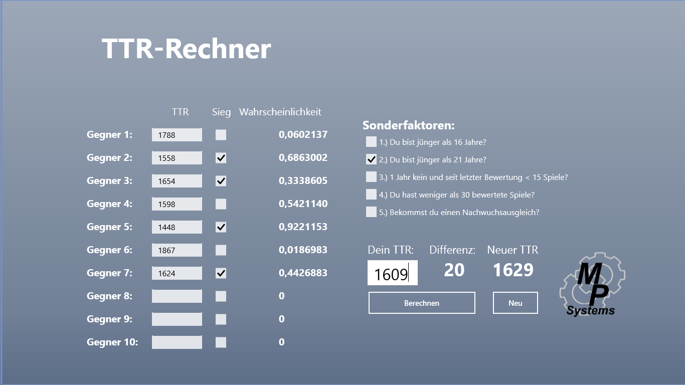 Berechnet die möglichen TTR Werte und die Performance des Spielers für einen Spieltag mit bis zu 10 Begegnungen.