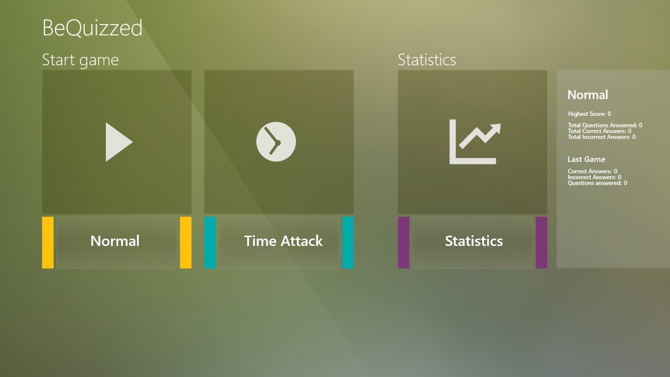 Do you want to test your knowledge? Do you want to have fun with a simple-yet elegant-looking game? Then BeQuizzed is what you are looking for. If you prefer a fast-paced gameplay try Time Attack mode and race against time to achieve the best score. If you prefer something slower yet challenging try the Normal Mode but be wary of your lives! You can also check out your stats via the Statistics tiles in the main menu to show your friends or track your progress.