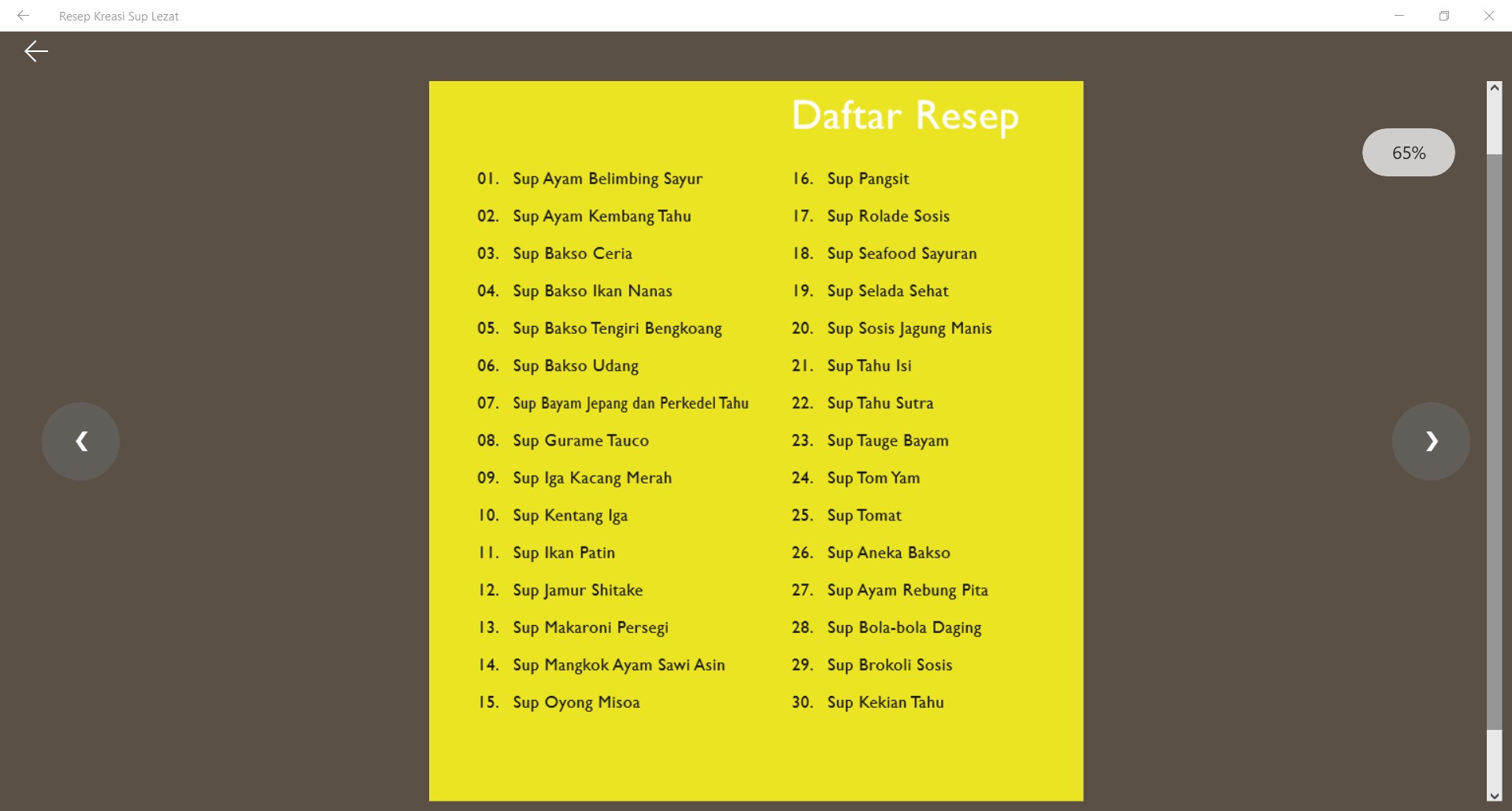 Berisi 30 kreasi resep sup yang sehat dan mudah dibuatDilengkapi dengan rincian bahan yang dibutuhkanLangkah-langkah proses memasak yang mudah diikutiDilengkapi dengan gambar resolusi tinggiTidak butuh koneksi internet untuk menjalankannya