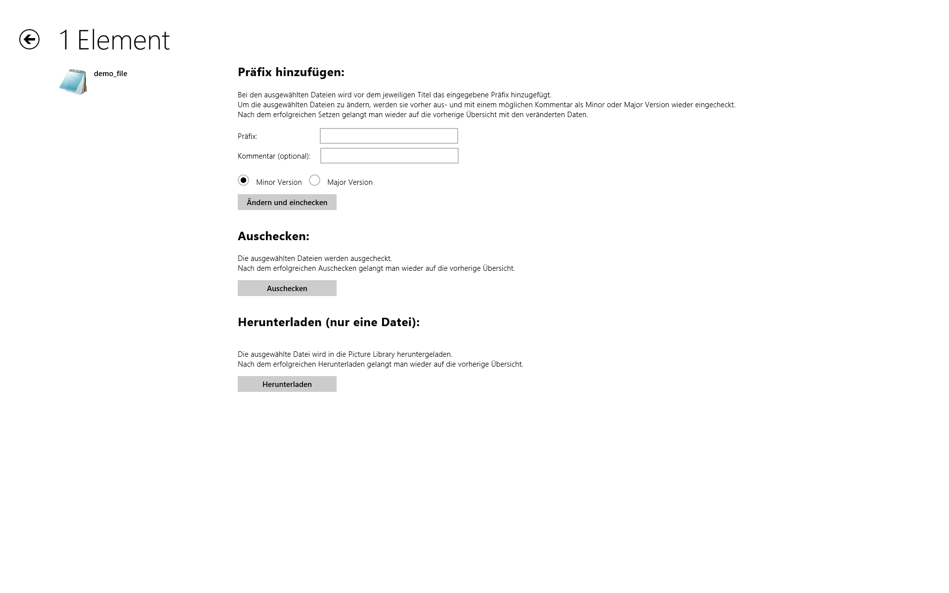 Anzeigen von Dateien und Ordnern in DokumentenbibliothekenMassen-Hinzufügen eines Prefix zu einem DateititelMassen-Download von Dateien in die BilderbibliothekMassen-Auschecken von DateienAnzeigen aller Metadaten zu einzelnden Dateien