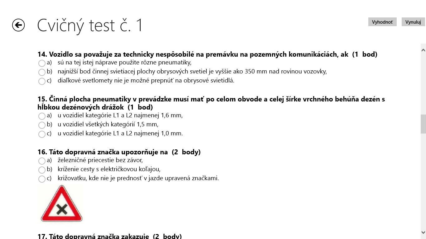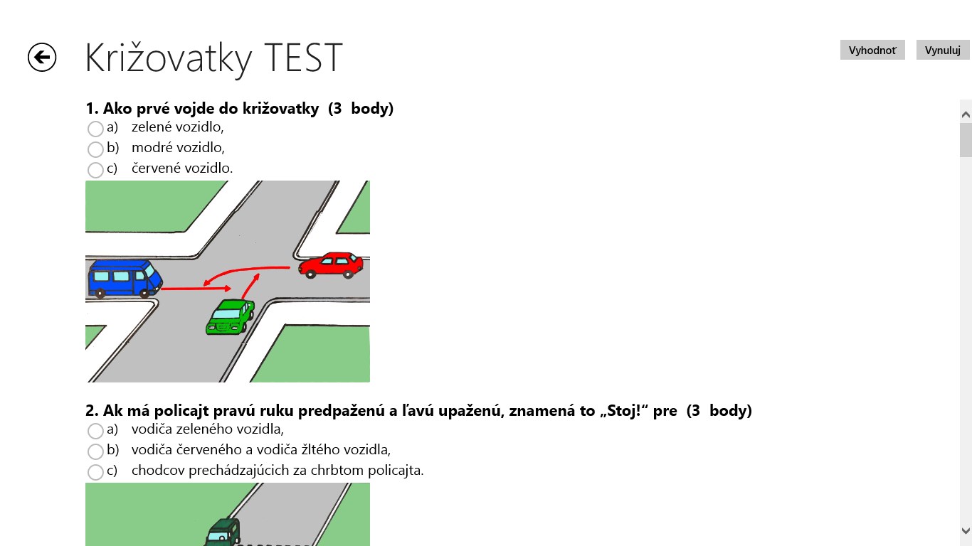 Aplikácia vám formou interaktívnych testov umožní naštudovať otázky pre skúšku v autoškole. Umožňuje zostaviť nový test z nesprávne zodpovedaných otázok z predchádzajúceho testu. Aplikácia obsahuje 35 cvičných testov + samostatné testy z teórie, dopravných značiek a križovatiek
