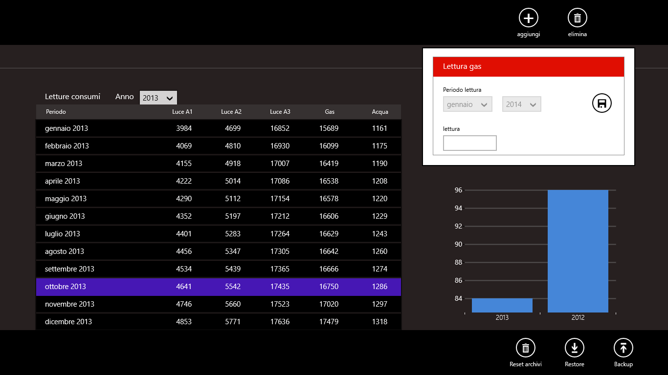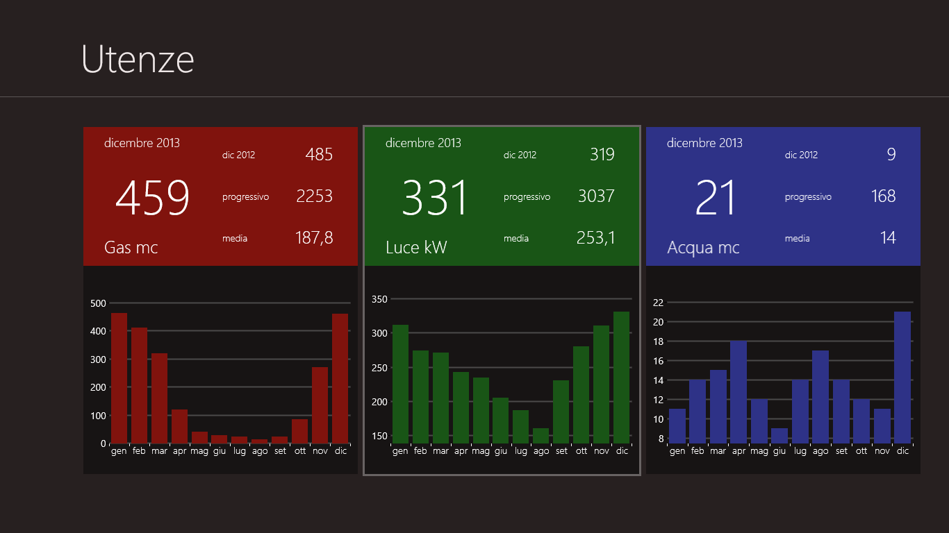 Registrazione delle letture di gas, acqua e luceCalcolo dei consumi mensiliCreazione storico dei consumiRapporto tra consumo mensile e media annualeGrafici dei consumi