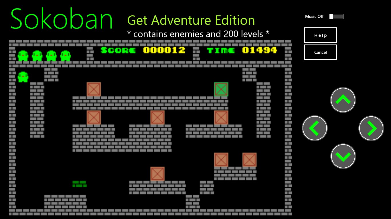 Modified version classical game which the player pushes green crate around in a warehouse, trying to get them to green platform. Compared to the classic Sokoban there is a gravitation. Brown boxes helps in the job is finished and you can destroy them. This edition contains 140 levels. Passwords are