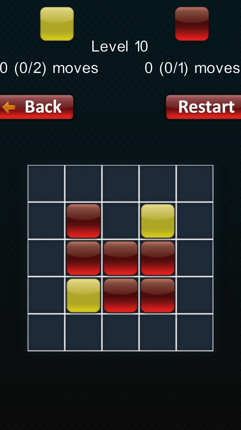 For those in the know, this is the block puzzle game featured in a SNES classic known as "Lufia 2". Level 10 is actually the puzzle from that game and a quite a difficult beast to beat in just 2 yellow moves and 1 red.