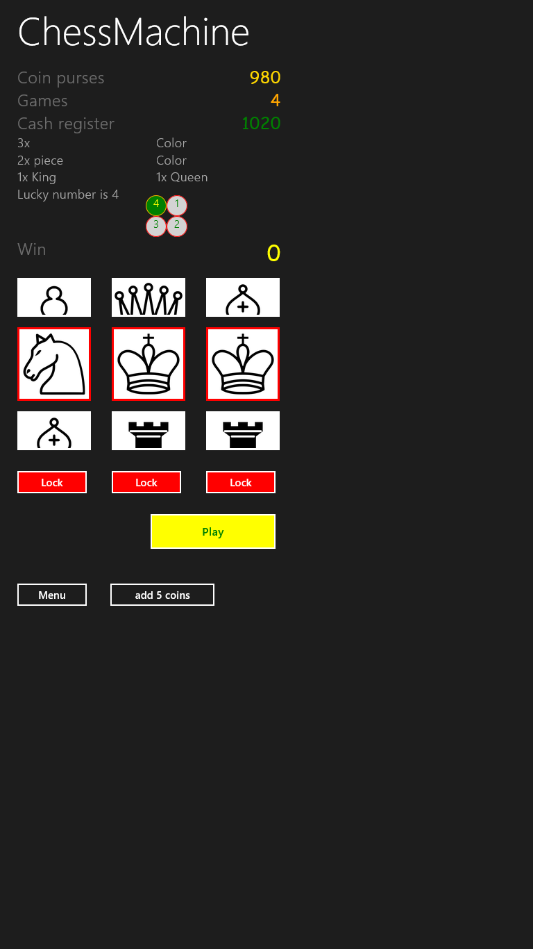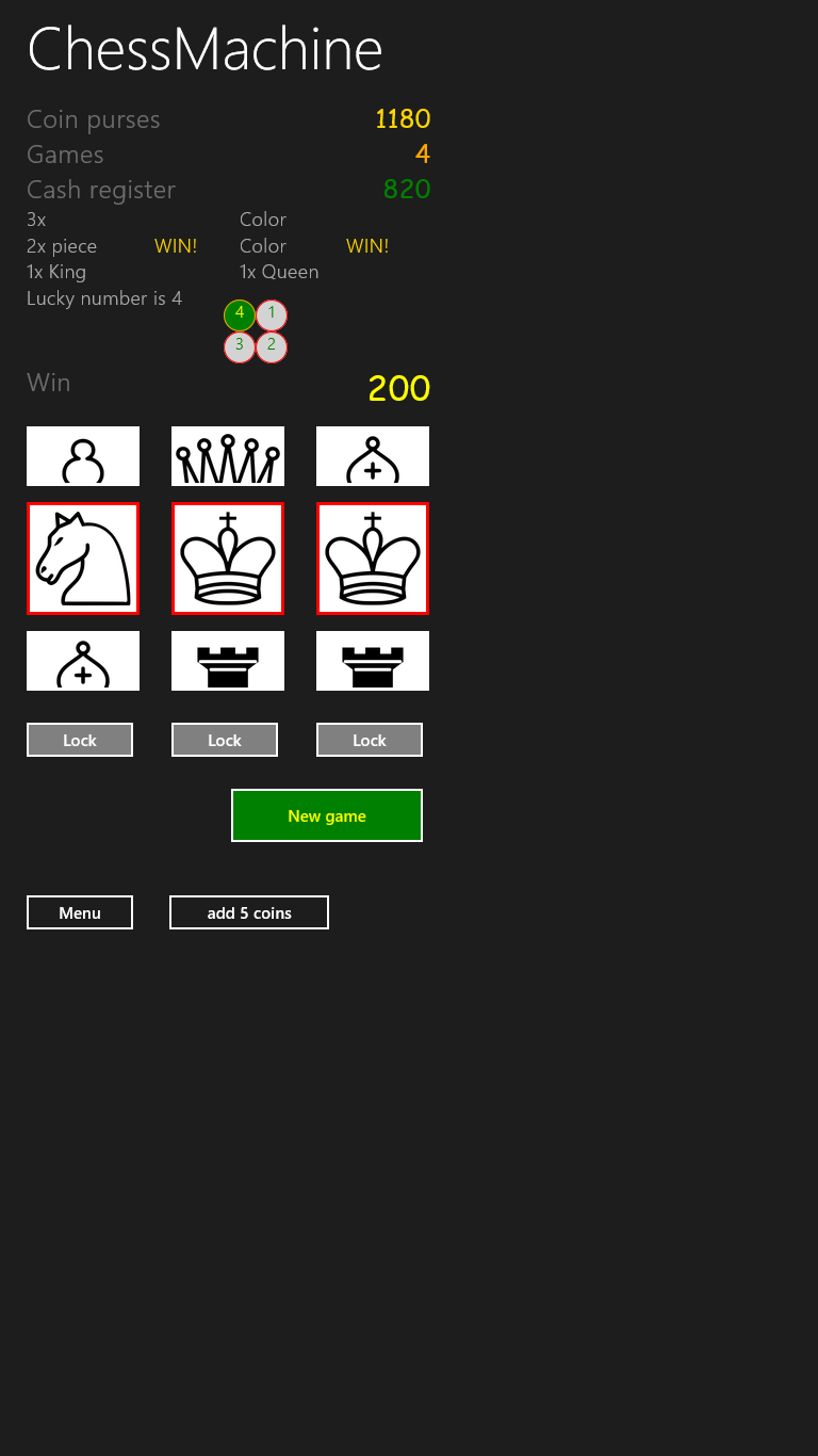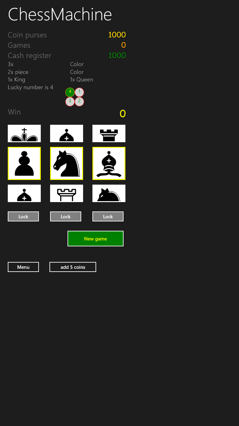 The chess-machine is a fruit-machine with chess as theme. Pieces have the same value as by the chessgame. At the begin you and the cash register have a ammount of coins. The first who win all the coins from the other, will win the game. Lay-out is update for 10" screen and police privacy is added.