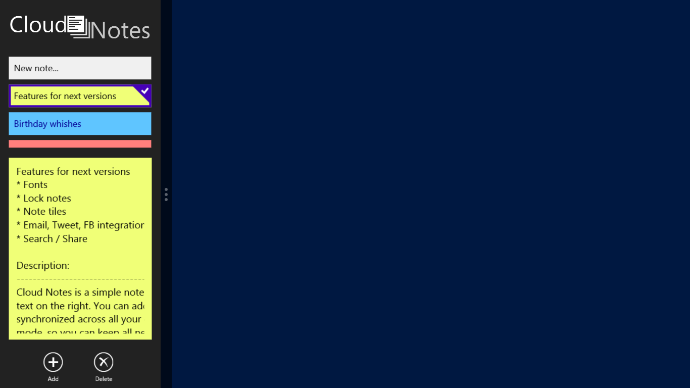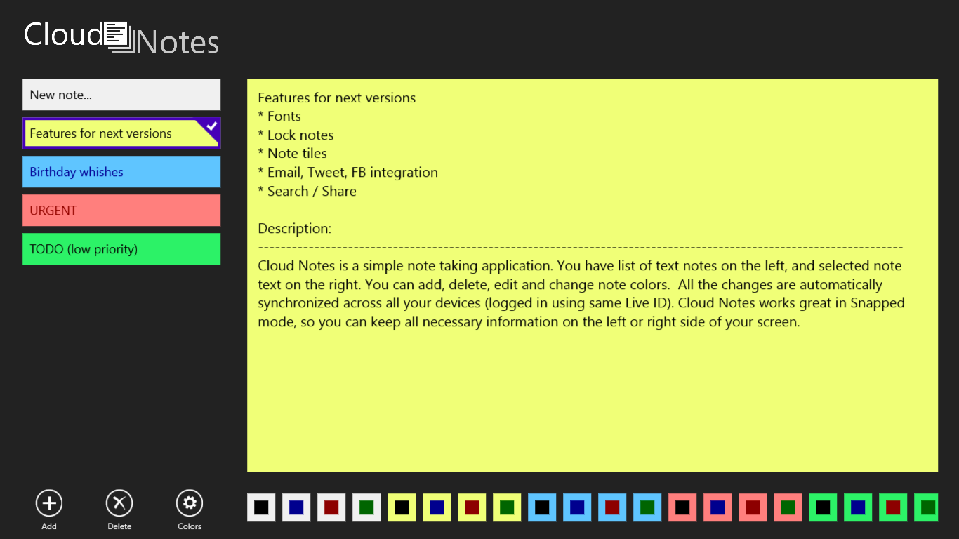 Cloud Notes is a simple note taking application. You have list of text notes on the left, and selected note text on the right. You can add, delete, edit and change note colors. All the changes are automatically synchronized across all your devices (logged in using same Live ID). Cloud Notes works great in Snapped mode, so you can keep all necessary information on the left or right side of your screen.