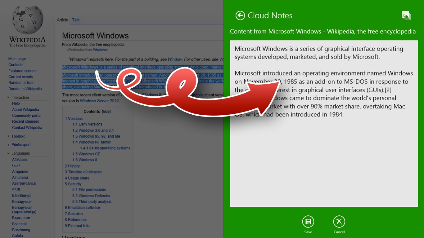 Take simple text notesSynchronize notes between all your Windows 8 devicesShare text and links into Cloud Notes from Mail or Internet Explorer