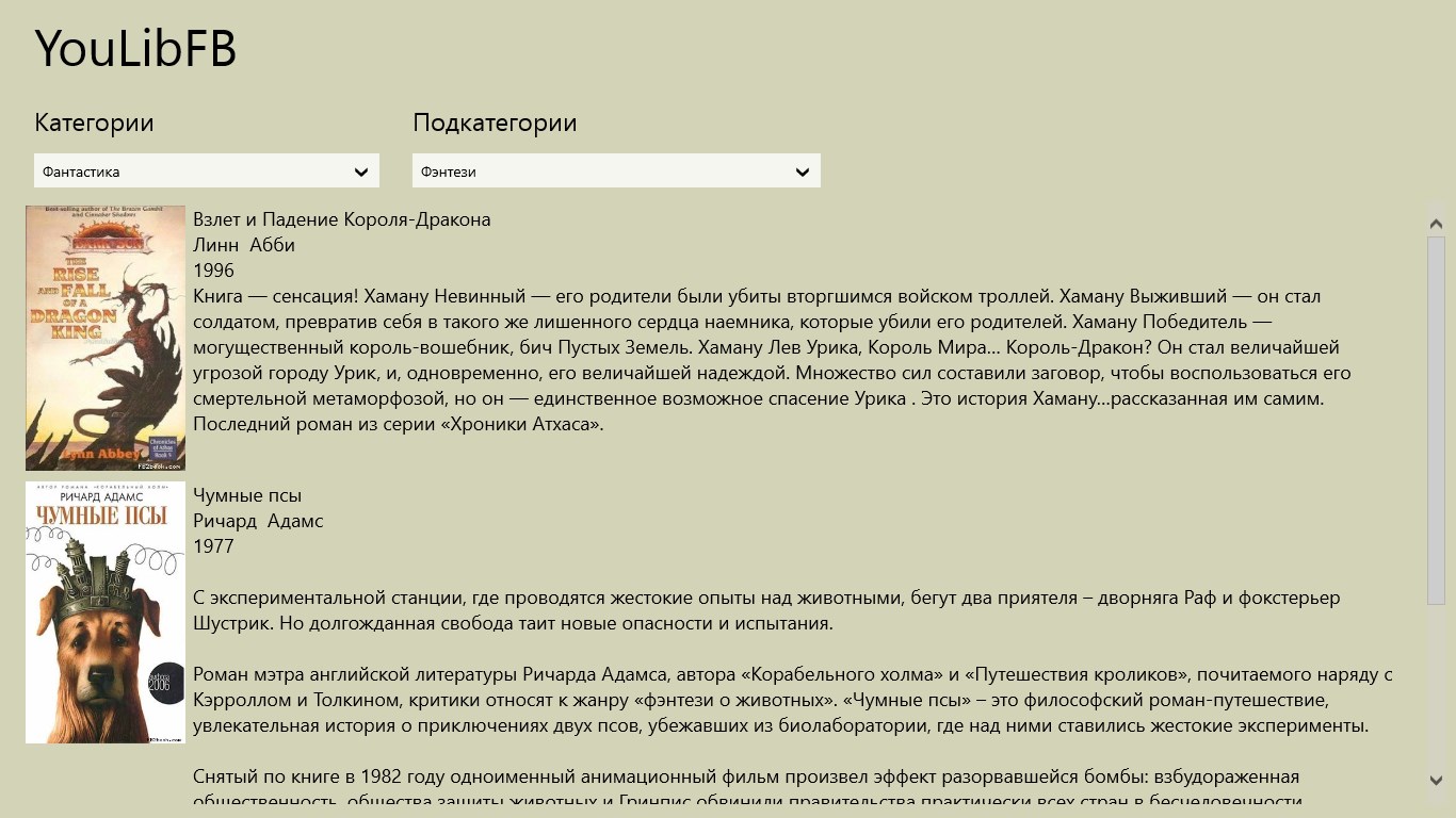 YouLibFB позволяет создать собственную библиотеку книг в формате FB2. Этот формат стал практически стандартом в русском Интернете. Поэтому вы можете найти множество книг в этом формате. Формат очень удобен. Например он делает очень простым добавление книг в библиотеку. Вся информация о книге берется из файла книги, что устраняет необходимость вводить имя автора и прочую информацию. Так же при помощи этой программы вы можете удобно читать книги. Так же вы можете управлять размером шрифта книги. Читалка умеет запоминать позицию в которой вы остановили чтение.