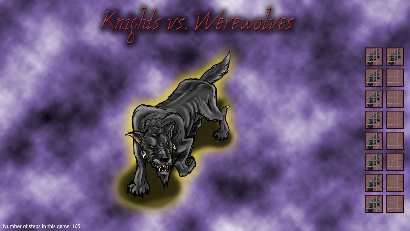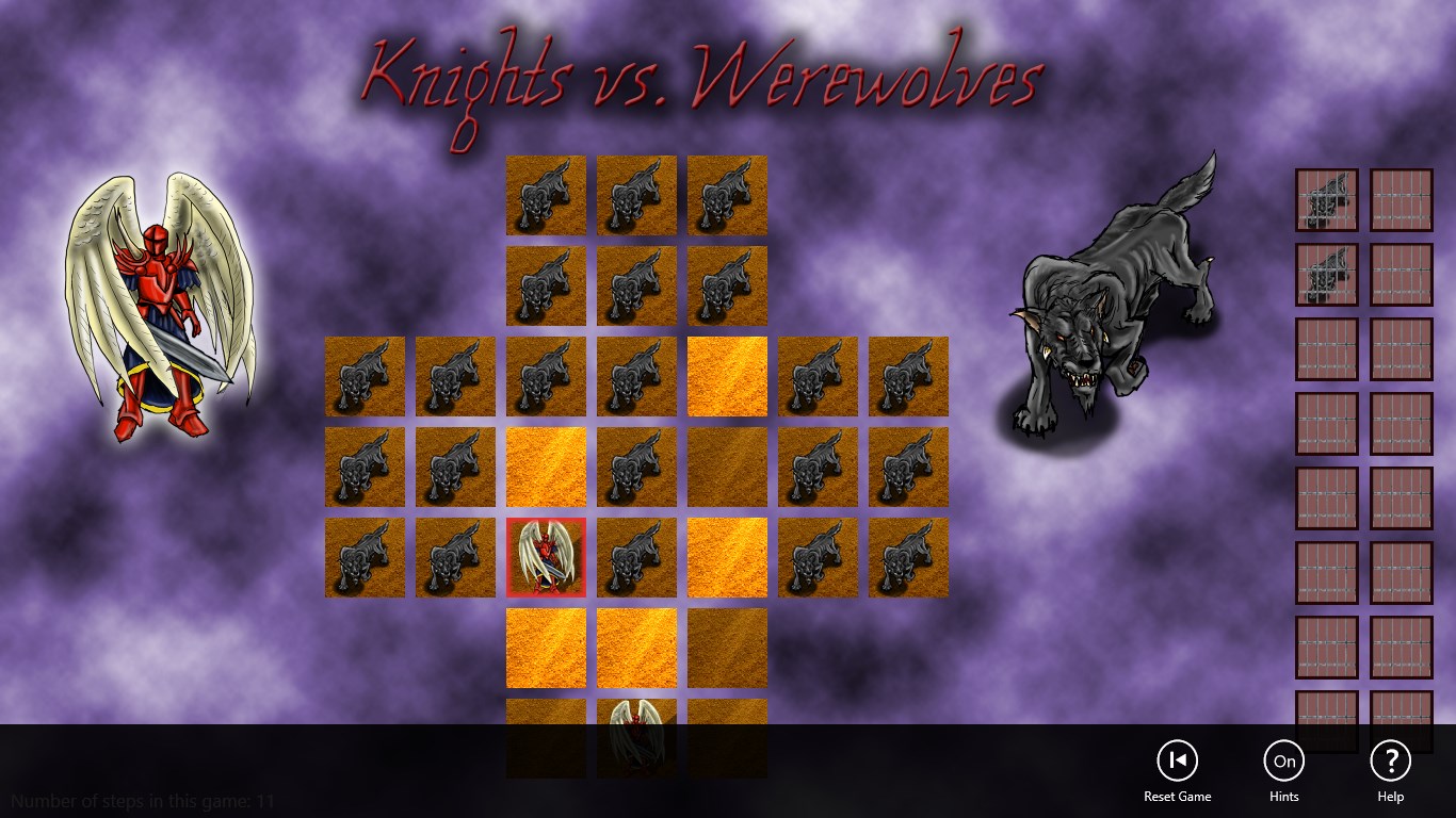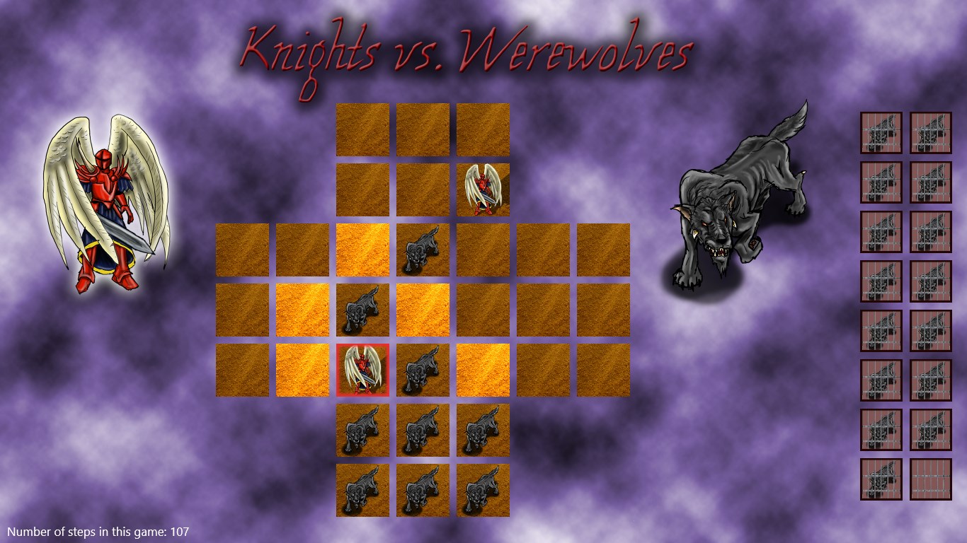 In this two-player tactical game you need to use your best strategy, because your opponent will try to defeat you. First of all, choose your side: Knights or Werewolves! After it, you and your opponent stepping one, by turns, and try to reach the Victory. In the never-ending war between Knights and Werewolves you should use your best weapon, your logic, if you want to win. Don't forget, if you practicing enught you can beat all of your friends in this game.
