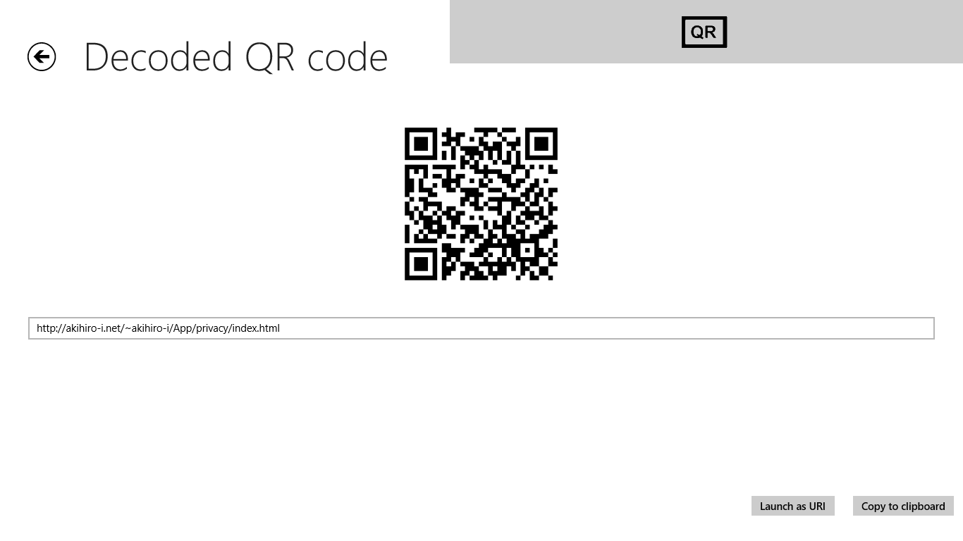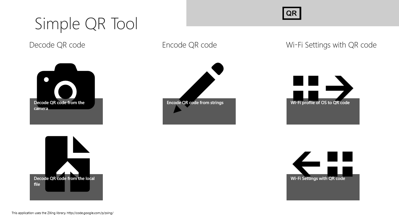 Decode QR code from image file or camera.Encode QR code from strings.Encode QR code from the uri by any browser. Please replace "http://" of URI to "sqt://".Save the encoded QR code.Print the encoded QR code.Share the encoded QR code to other app (ex. Mail).Launch the results of read the QR code as the URI.Copy the results of read the QR code to the clipboard.Converting Wi-Fi profile of OS into QR code. (v10.1.0)Converting QR code into Wi-Fi profile and set up Wi-Fi Profile. (v10.1.0)Send and Receive Wi-Fi Profiles by Wi-Fi Direct. (v1.1.1)
