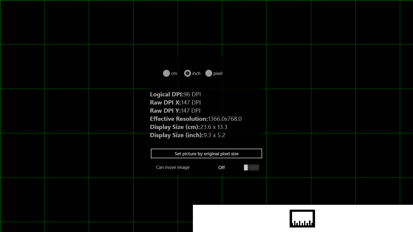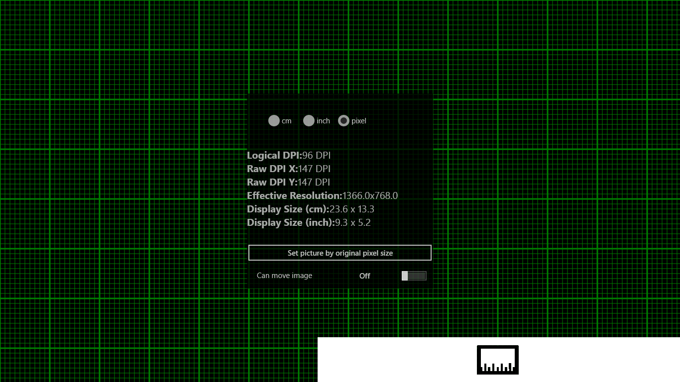 Show ruler on the screen (cm, inch, pixel)Show screen\'s infromation (DPI, resolution, display size)You can measure the opened picture by the ruler on the screen.