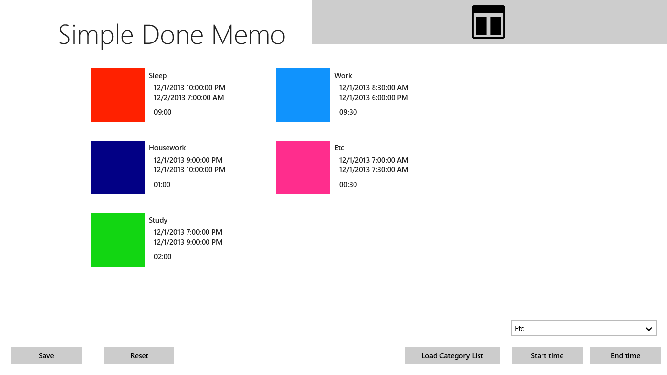 Recording the actions of the day.You can set own category list to this app from text file (UTF-8).The recorded data can be output to a CSV file.