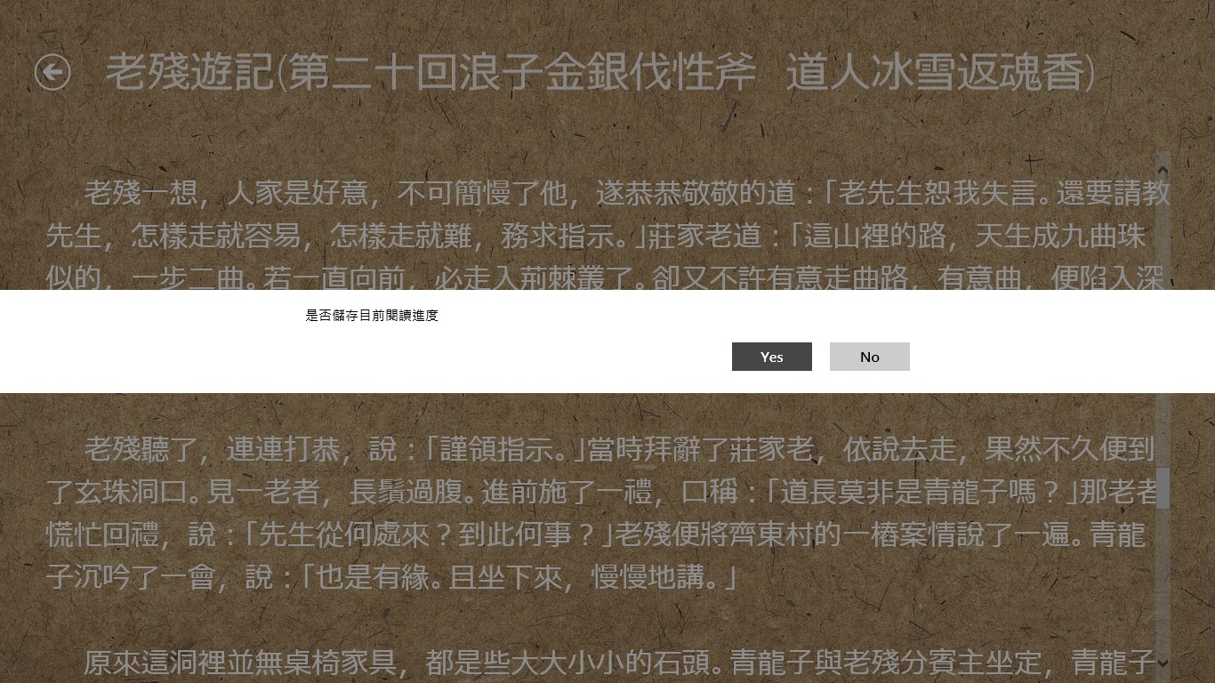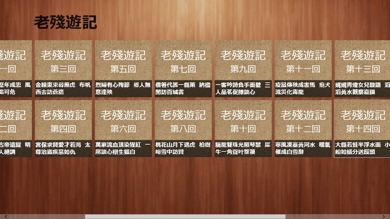 中國古典文學的老殘遊記小說電子版,方便隨時隨地進行閱讀,並可儲存與讀取閱讀的進度
