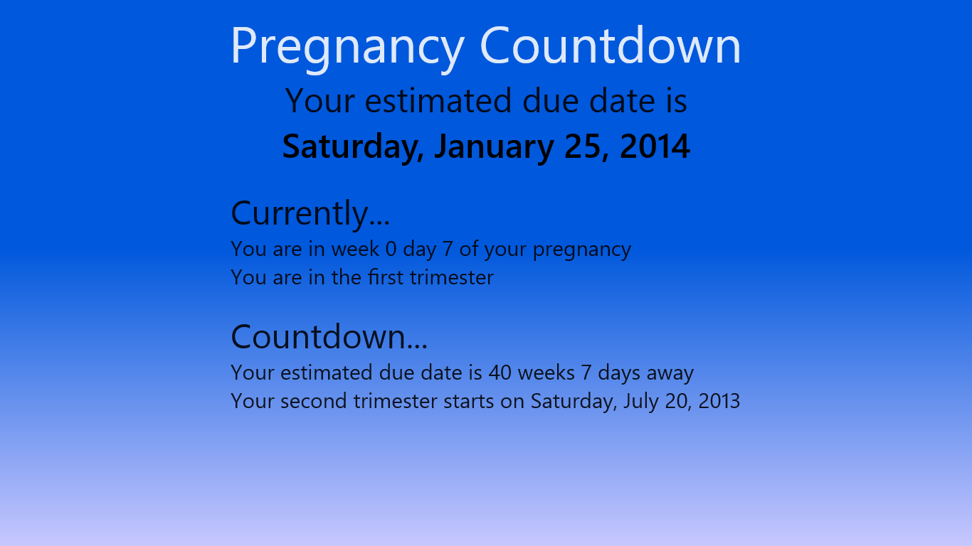Tracks how how far along your pregnancy isCalculates due dateDisplays your progress in a Live Tile