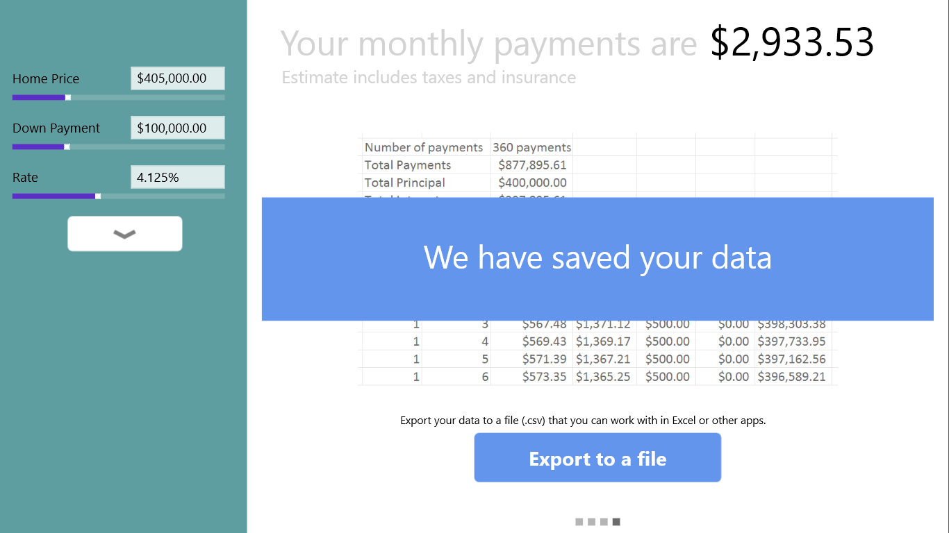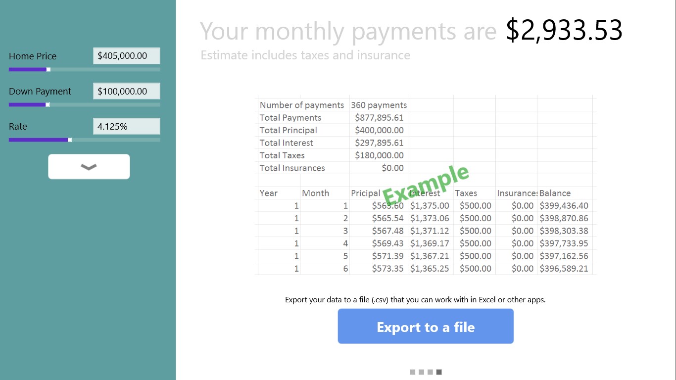 Calculate monthly paymentTouch friendly inputsVarious charts showing different views of your paymentSupport snapped view for multitaskingLive tile of your monthly paymentExport amortized data to a file (.csv) [full version only]