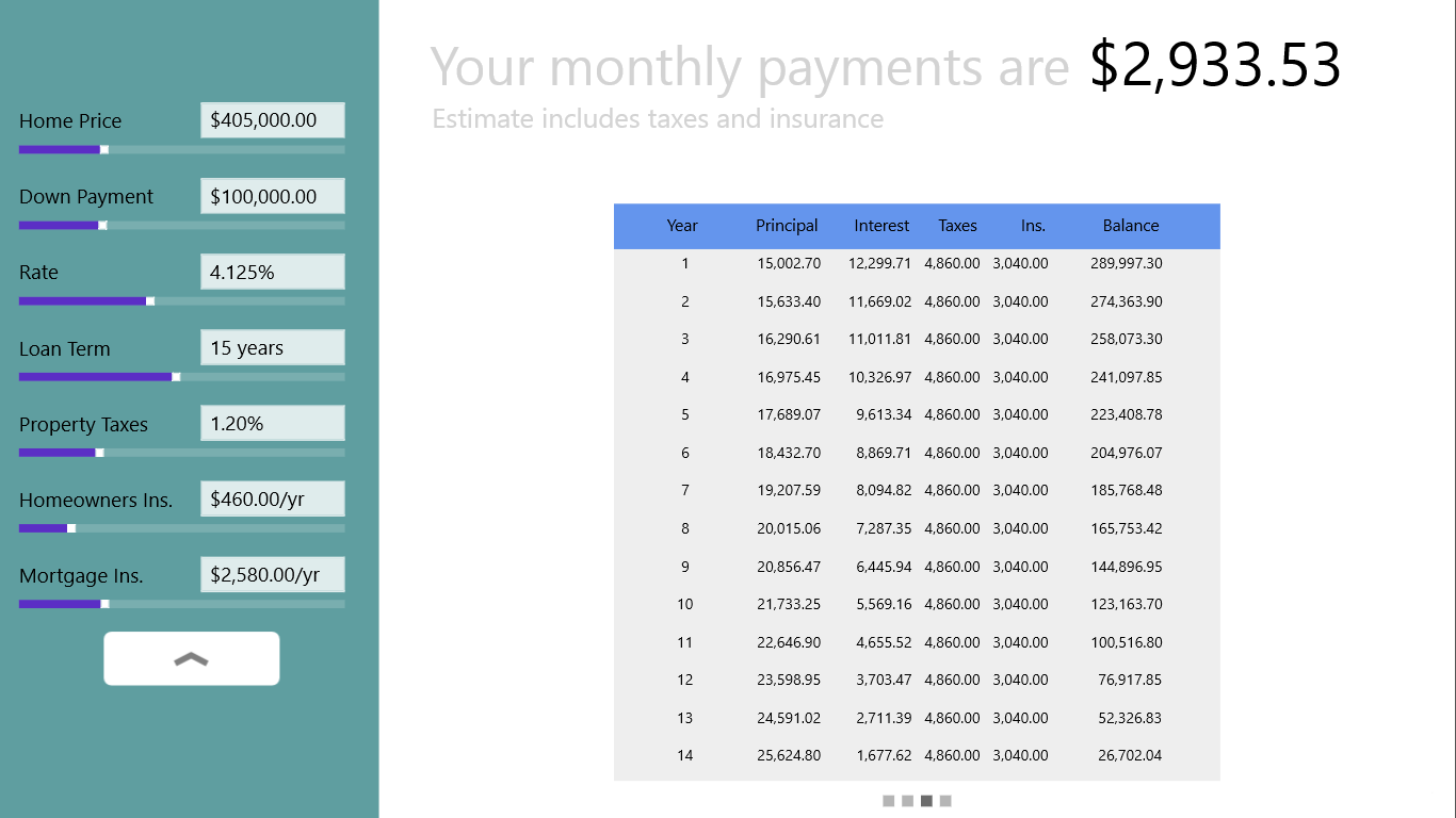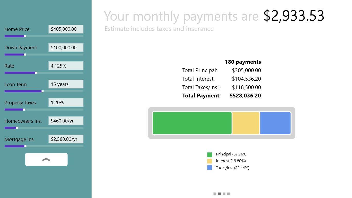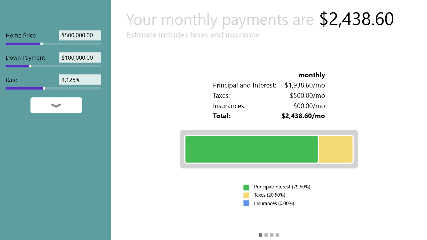 Touch friendly mortgage calculator is here. Simple, nice and clean interface helps you to determine your monthly mortgage payments easily. It works great on your touch device with sliders and a flip view. The calculator remembers where you left off and you can come back and continue your work later.