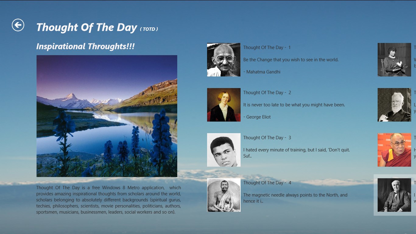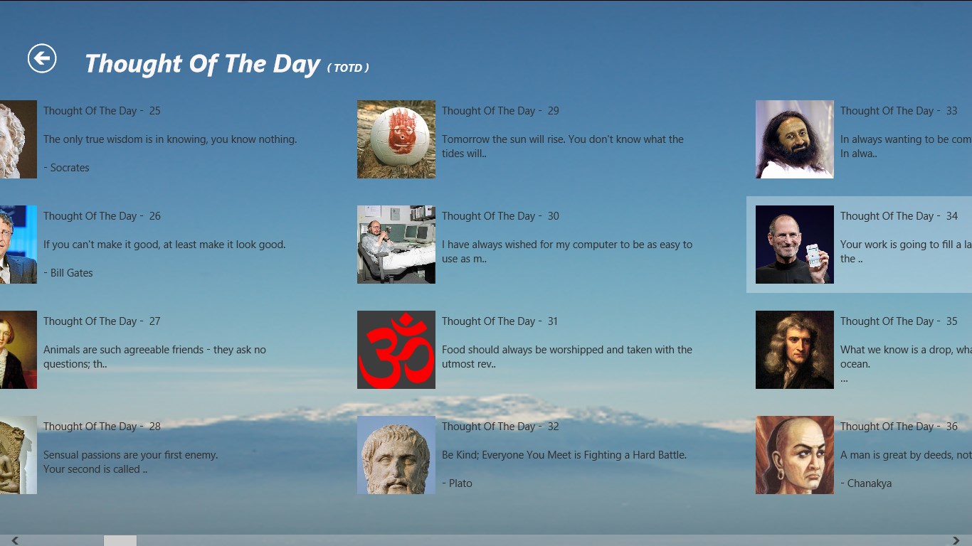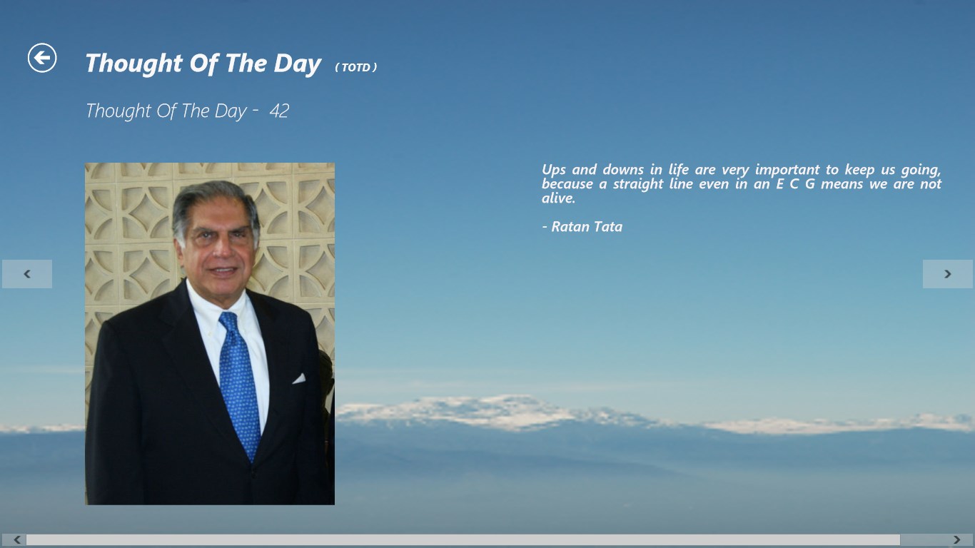 “Thought of the Day” is a free application, which provides amazing inspirational thoughts from scholars around the world, scholars belonging to absolutely different backgrounds (spiritual gurus, techies, philosophers, scientists, movie personalities, politicians, authors, sportsmen, musicians, businessmen, leaders, social workers and so on).