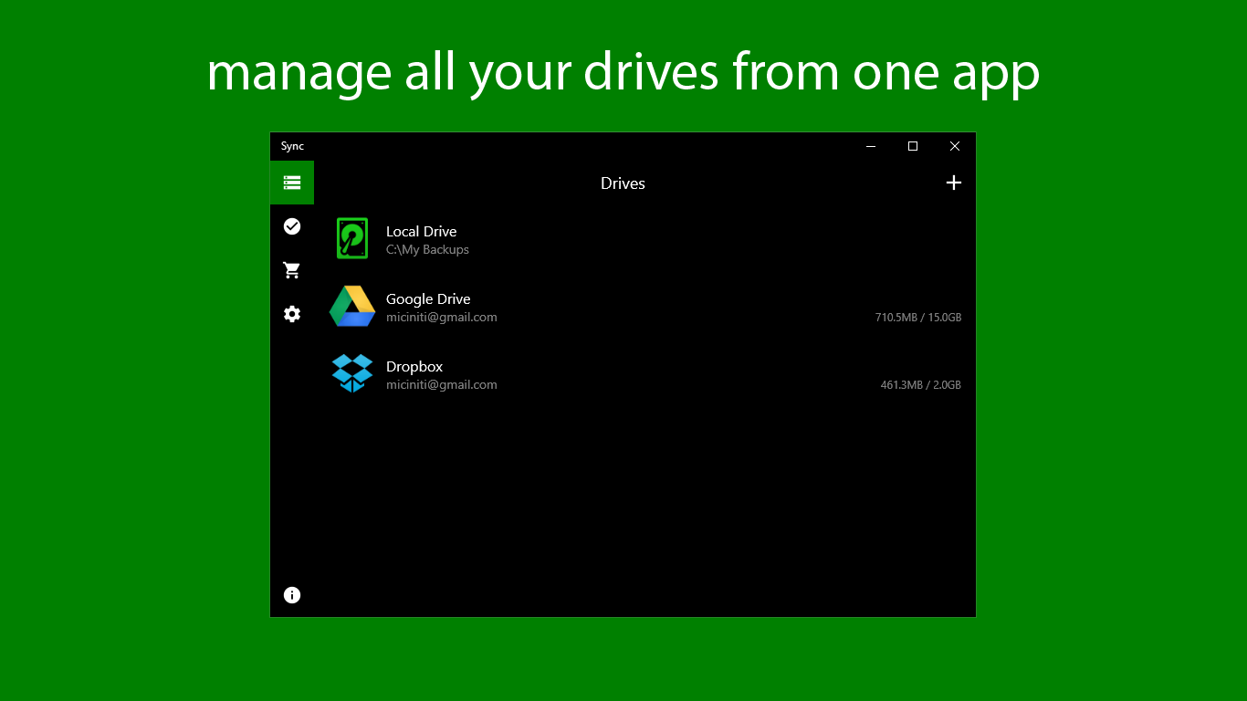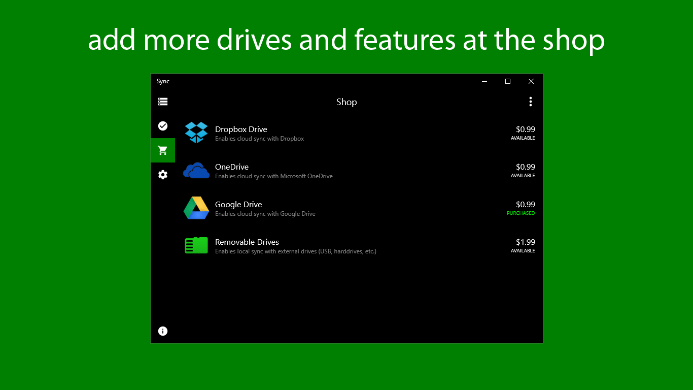 Local drive is free while Removable drives and Cloud storage drives are available via in app purchase at the Sync Shop.