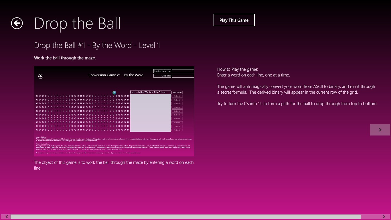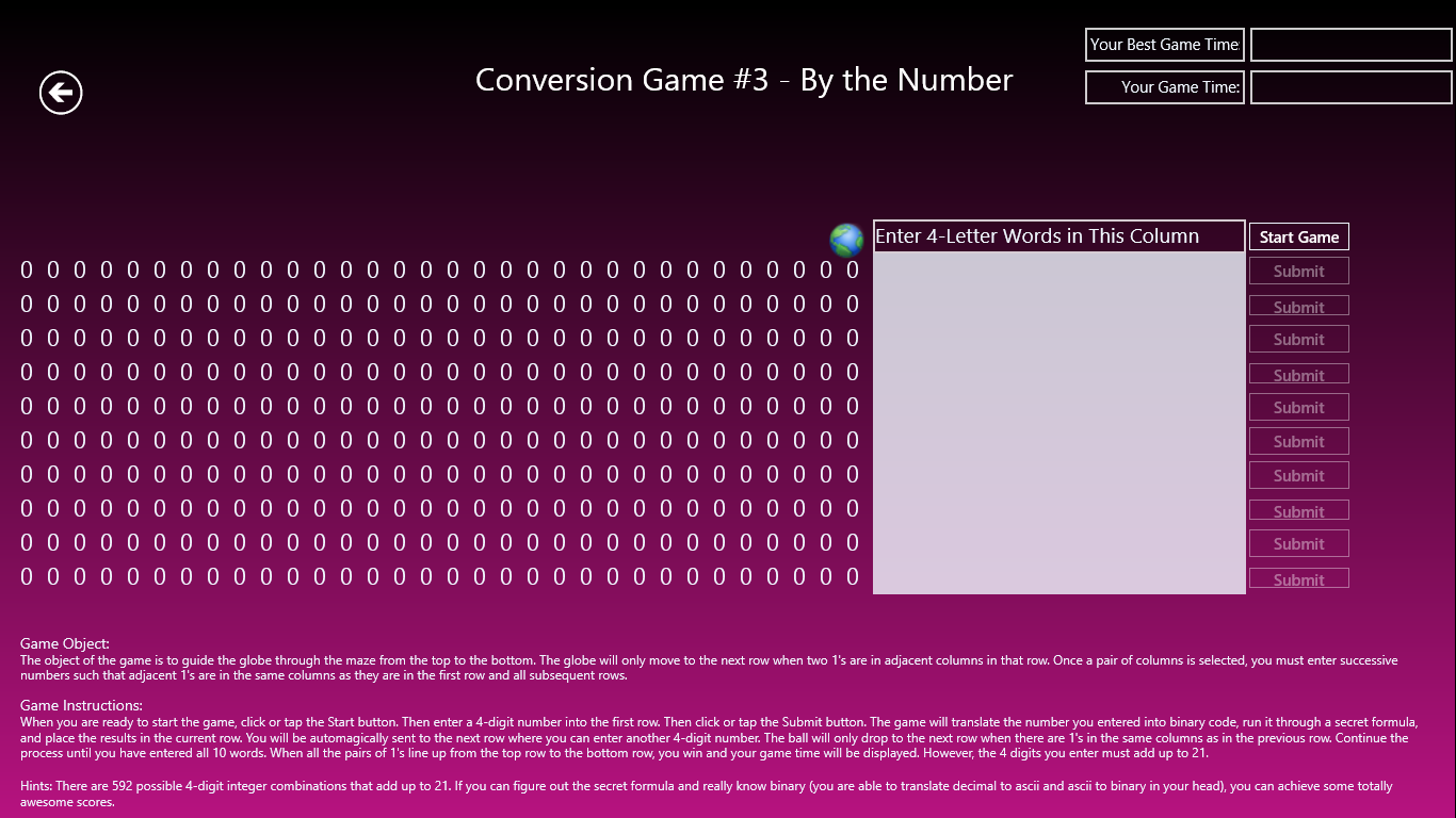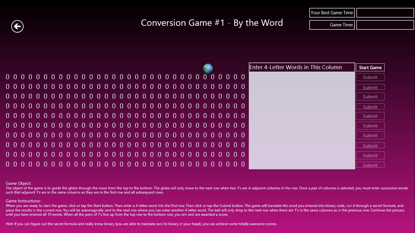 The object of the game is to guide a globe through a grid from the top row to the bottom row. The user enters 10 words, hex characters, or integers, one at a time. The words are translated from ascii to binary, and sent through a secret formula. The results of the translation are posted in the grid, one row for each word as 1's and 0's. The globe will only move to the next row when two 1's are in adjacent columns in same row. Once a pair of columns is selected, the user must enter successive words such that adjacent 1's are in the same columns as they are in the first row and all subsequent rows. Think it's easy? Give it a try!