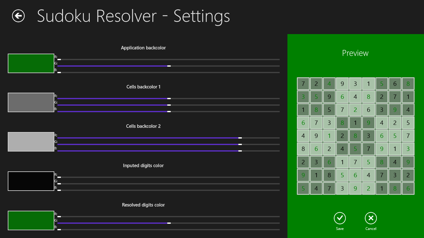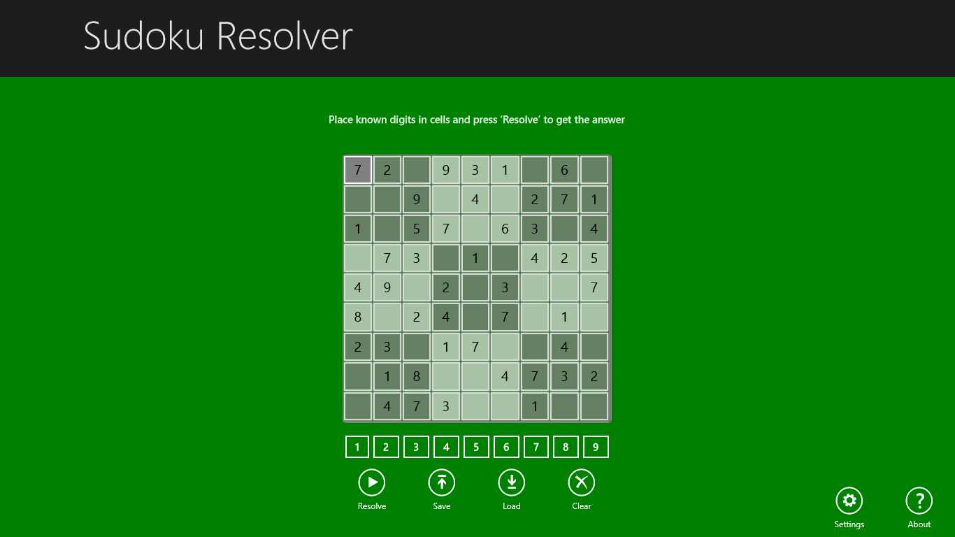 Solves 9x9 Sudoku puzzles. Just input known digits to cells and press “Resolve” to get the answer. Impress your friends and colleagues!