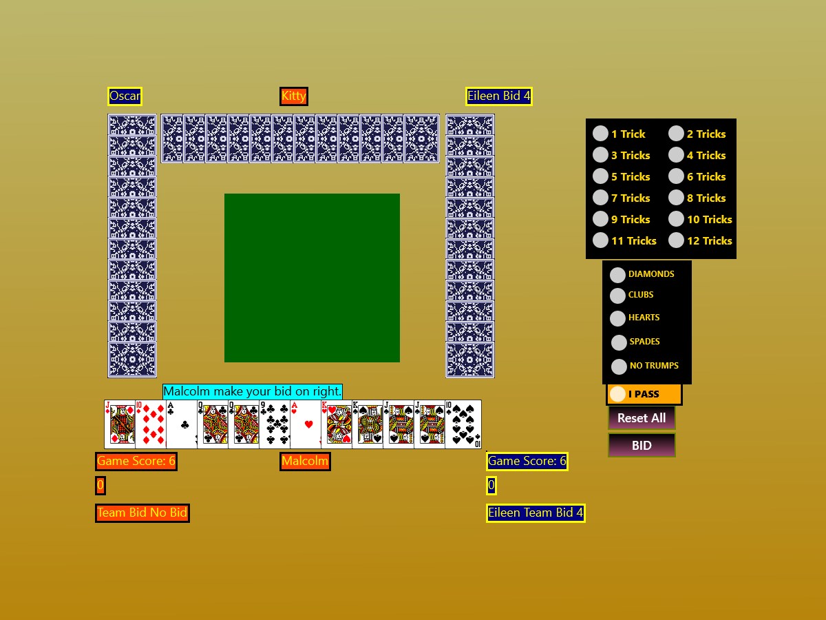Bid Euchre is an adaption of the game Euchre. The highest trump is the jack of the trump suit and second Jack same color suit. A double deck is used containing two of each card. When two identical cards are played to the same trick, the first to be played beats the second. Each player has just one opportunity to bid. If the bidding side win at least as many tricks as they bid, each side scores one point for each trick