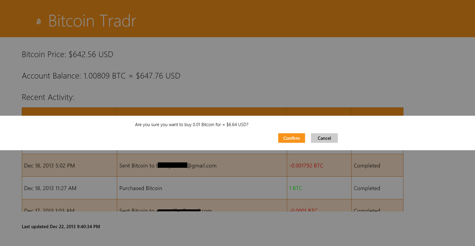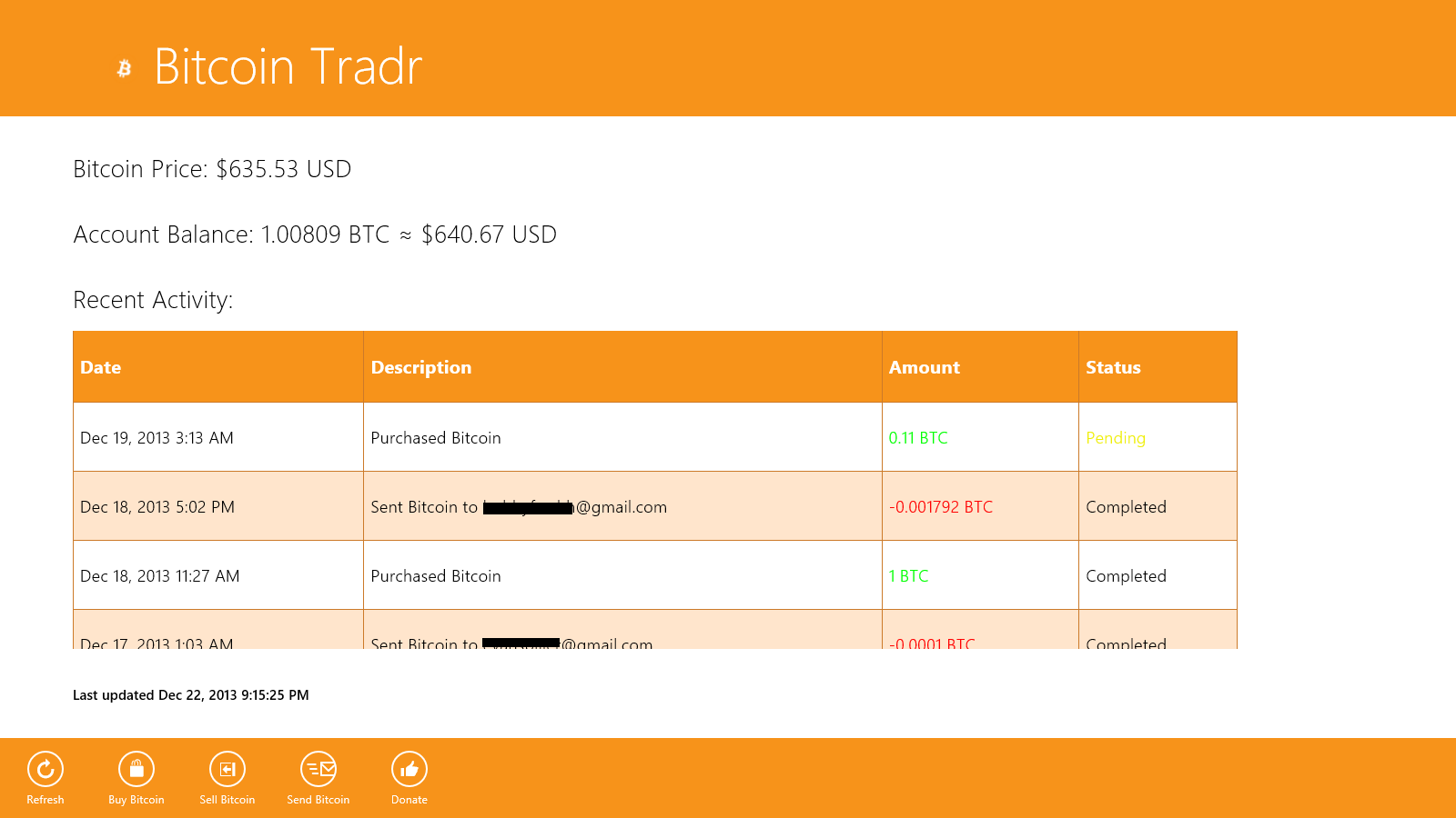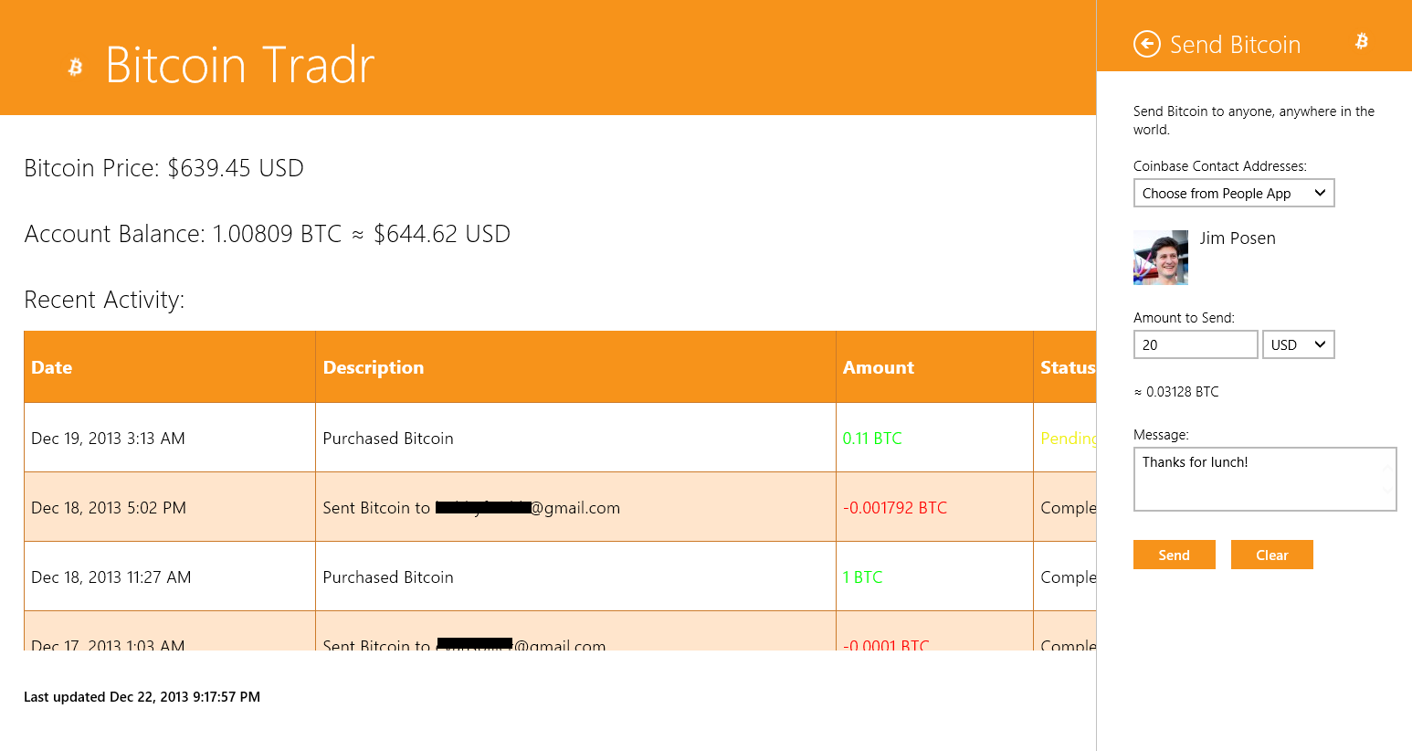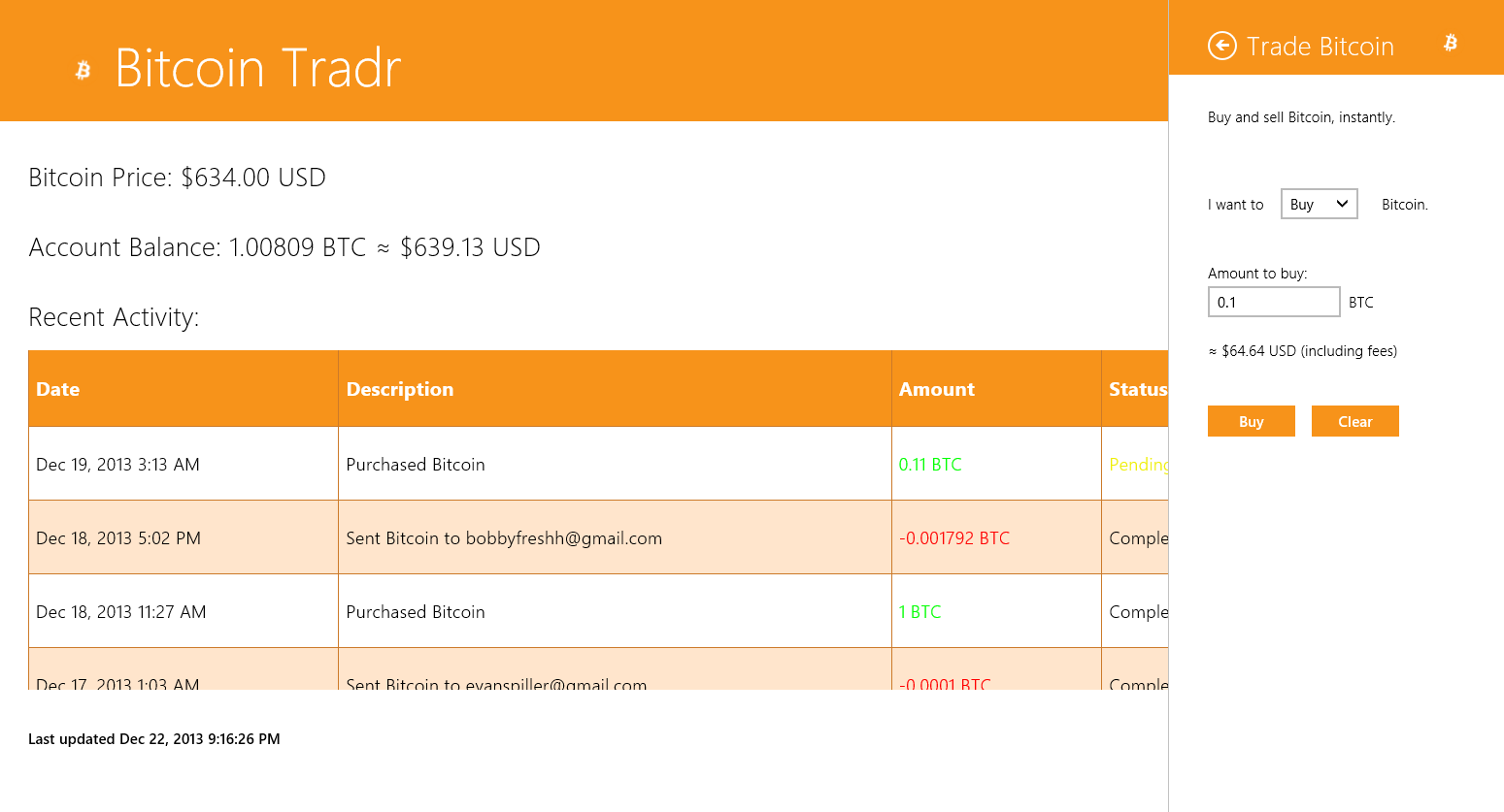 Buy, sell, and send Bitcoin from your Windows device for free! Bitcoin Tradr is an open source app for the Coinbase.com digital Bitcoin wallet service for Windows that lets you buy and sell Bitcoin, check Bitcoin prices, as well as send and receive Bitcoin from others.