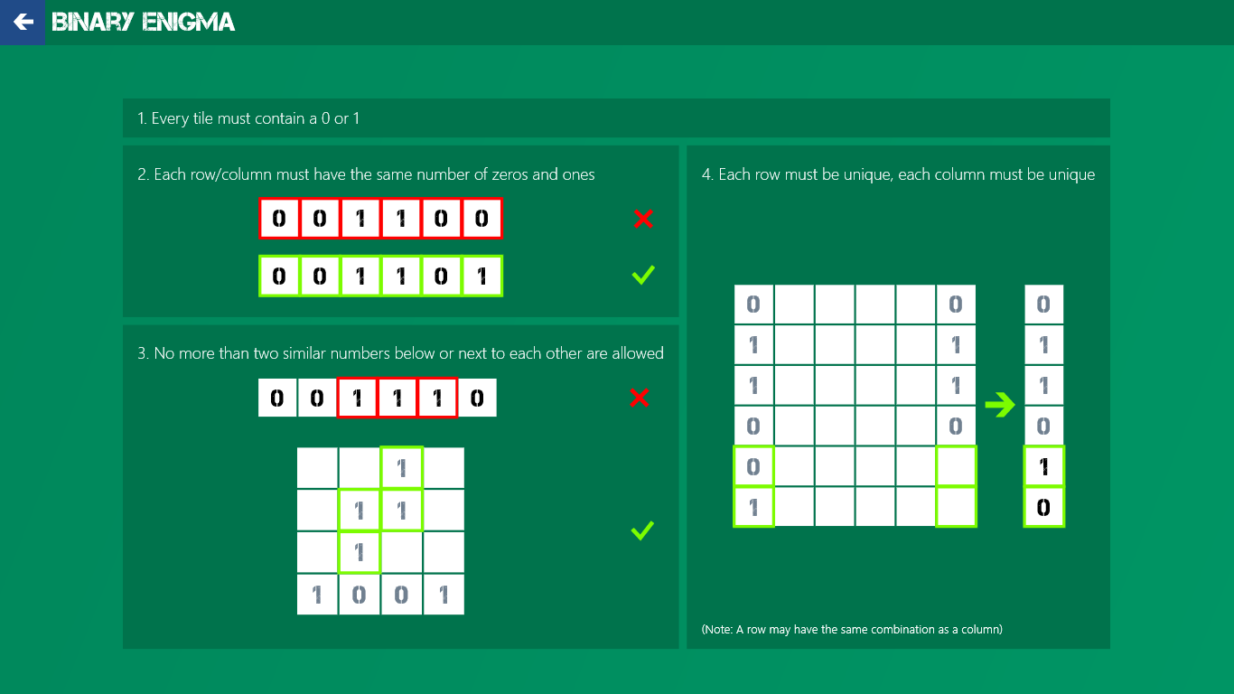 - New: When you solve something incorrectly, Binary Enigma will highlight the rows and columns containing errors