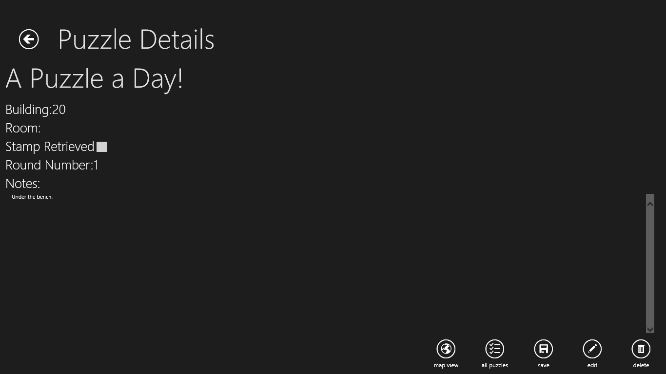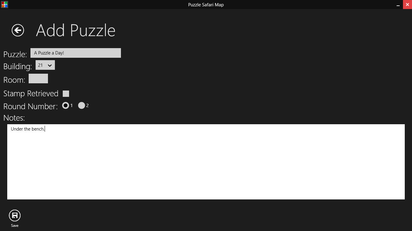 Puzzle Safari Map lets puzzlers enter information about stamp locations that instantly appears on runners' phones. Runners can see all of the stamps they haven't yet retrieved on a map with their location so they can plan out routes. Stamp data is encrypted so only team members can get to it.