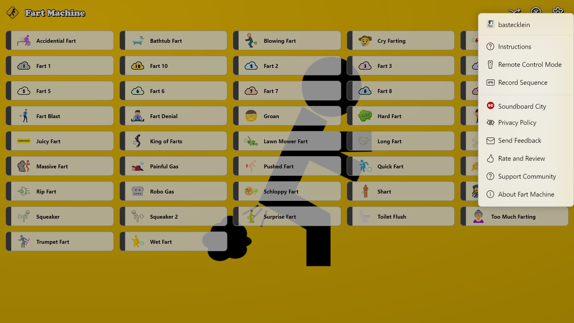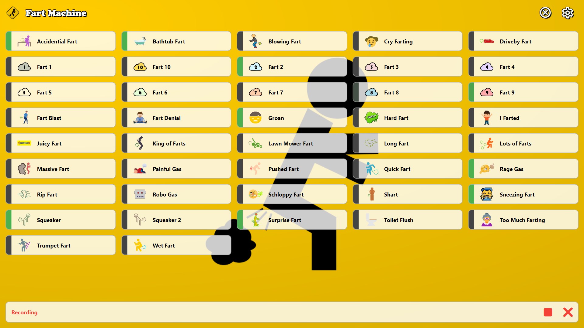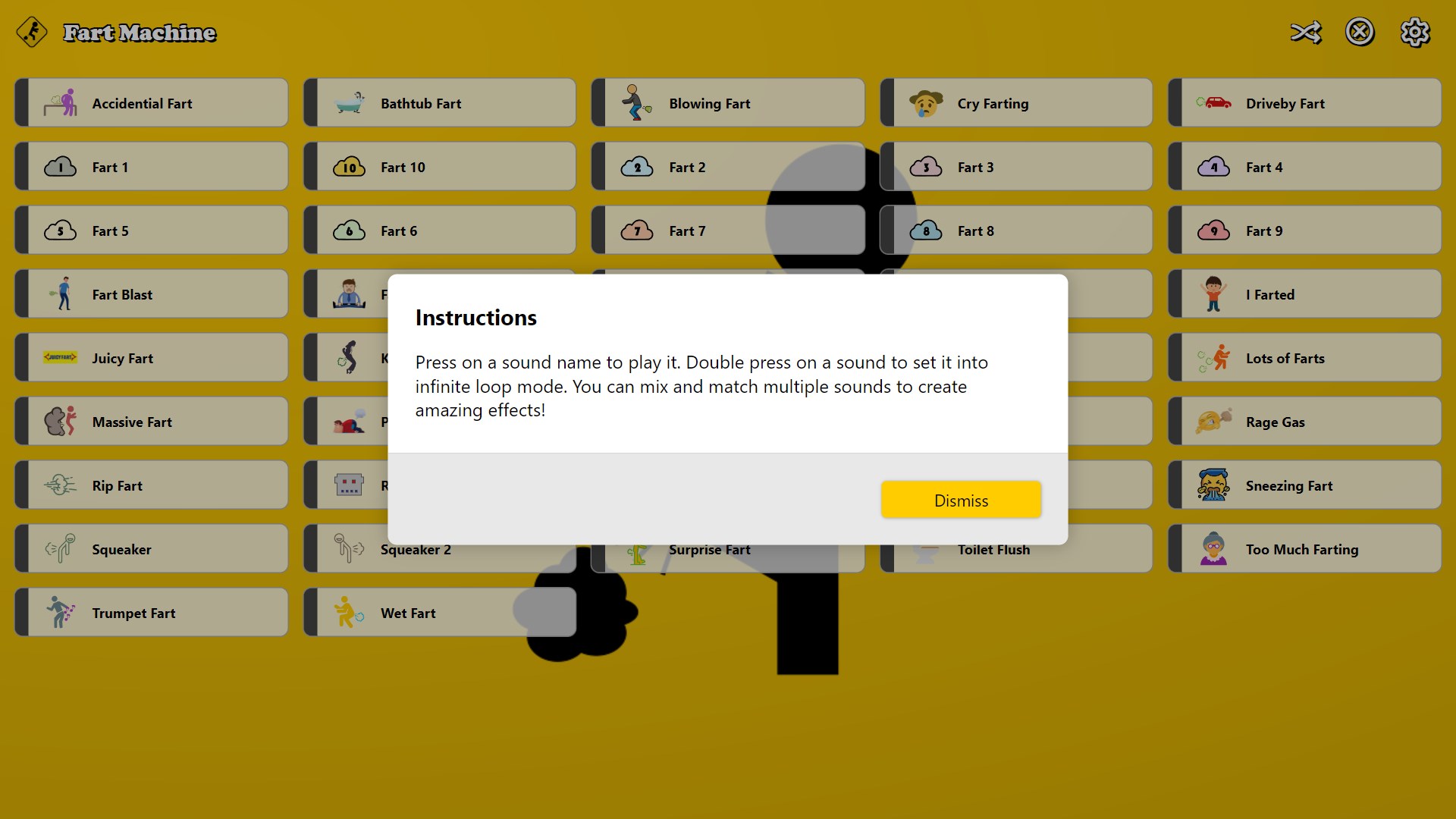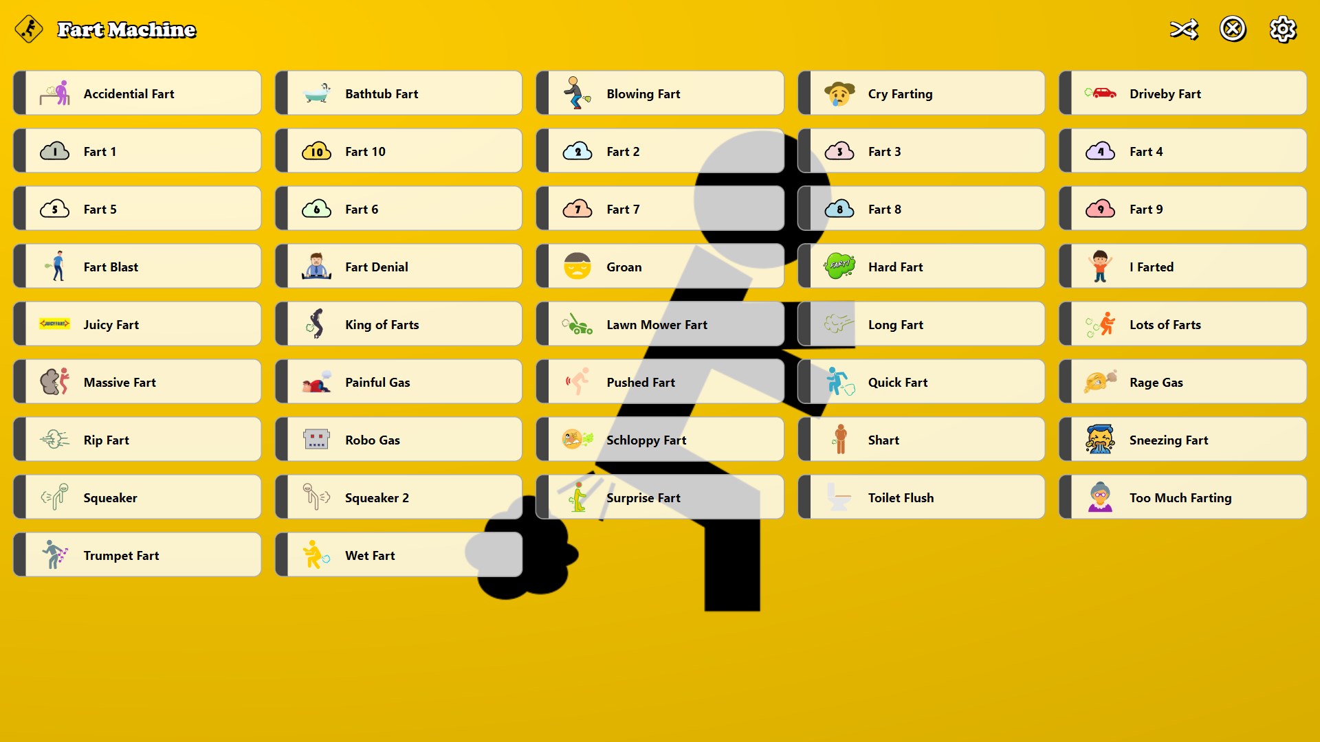 Fart Machine is loaded with hilarious low maturity fart sound effects in classic soundboard format. Tap the buttons for high quality stereo fart sound effects. Guaranteed for hours of humor and laughter. You can play multiple sounds at once for the ultimate fart experience, or set the farts into infinite loop mode for extreme pranking!
